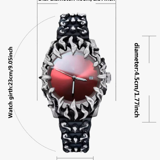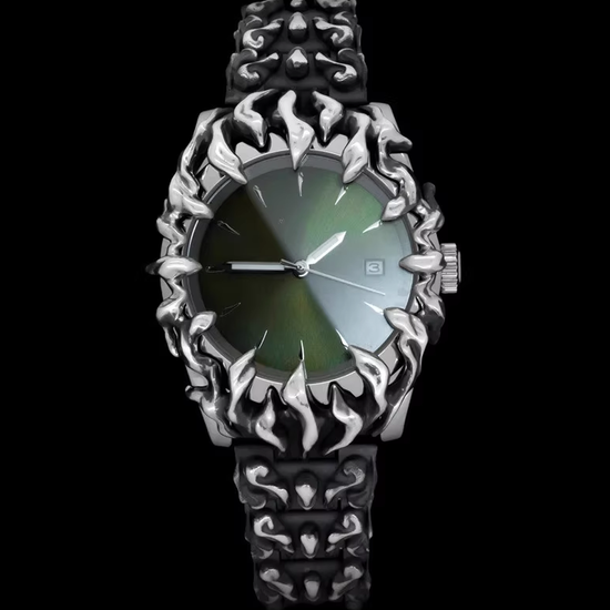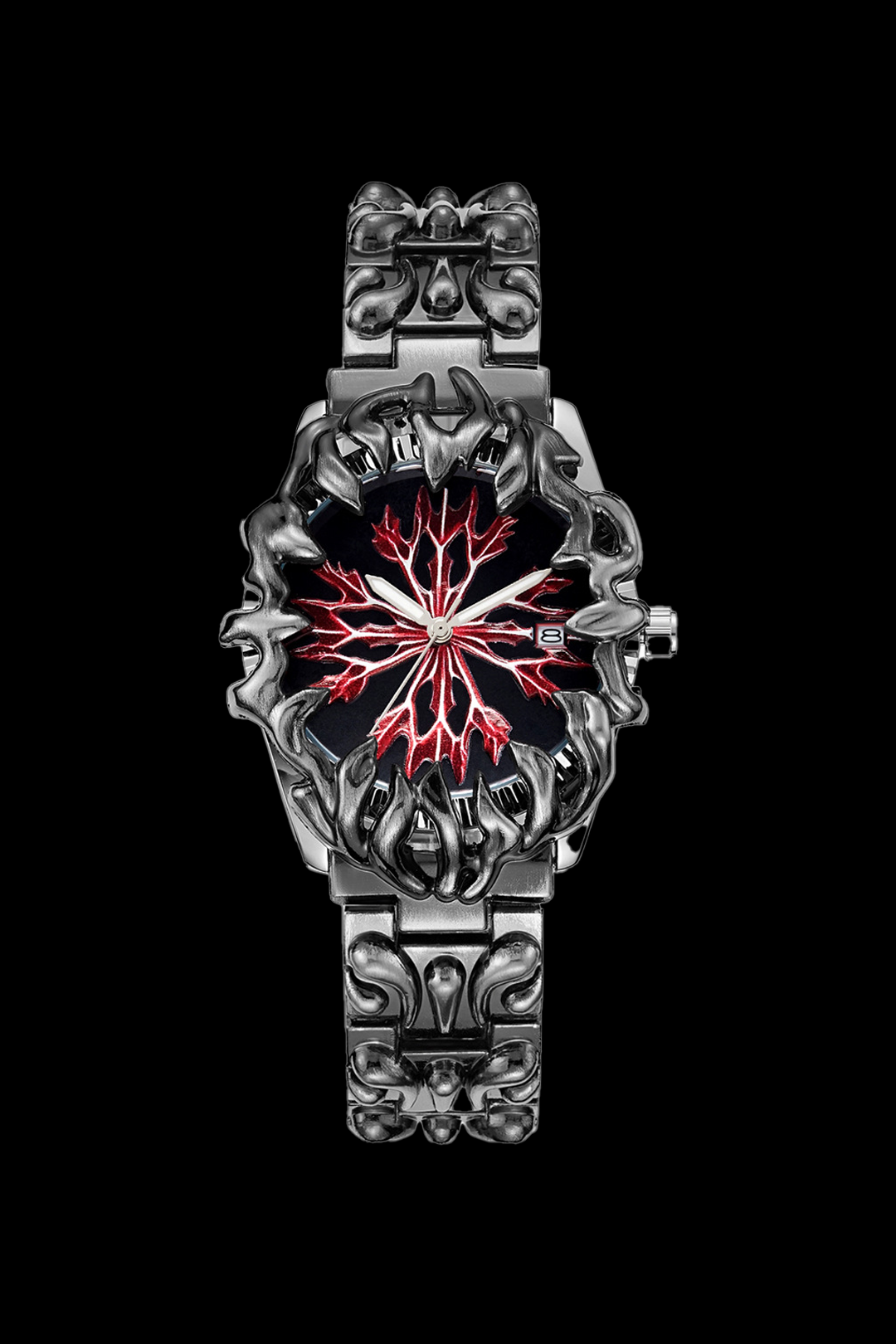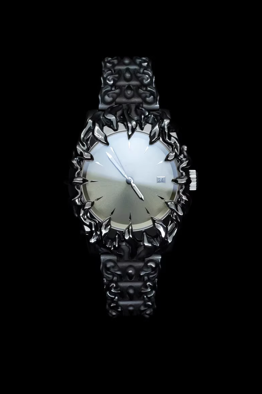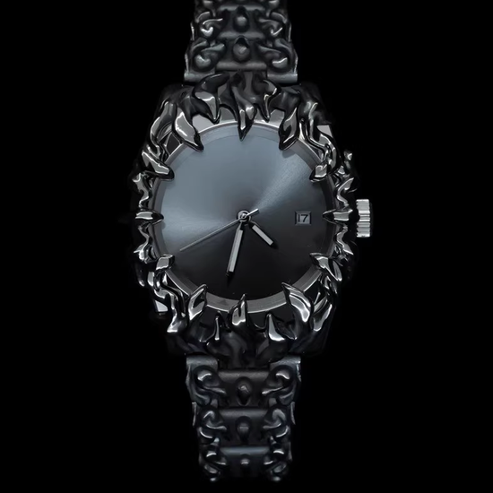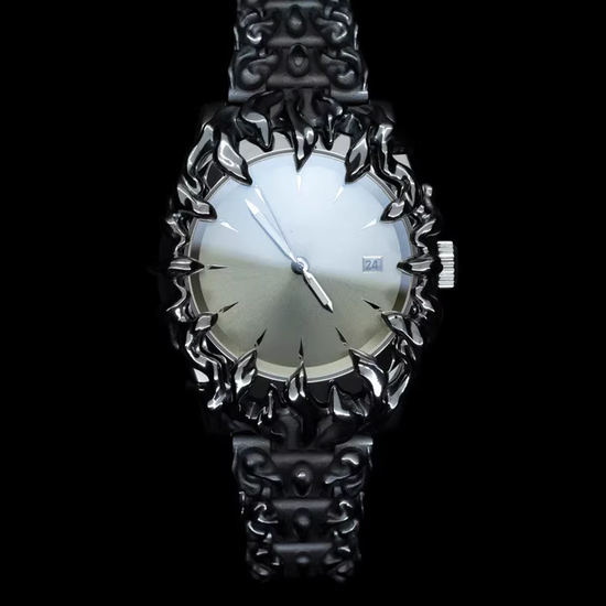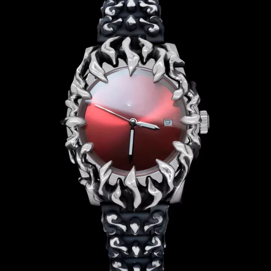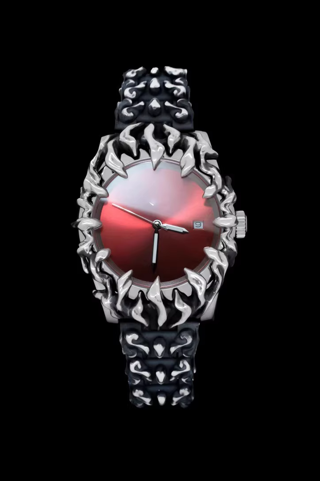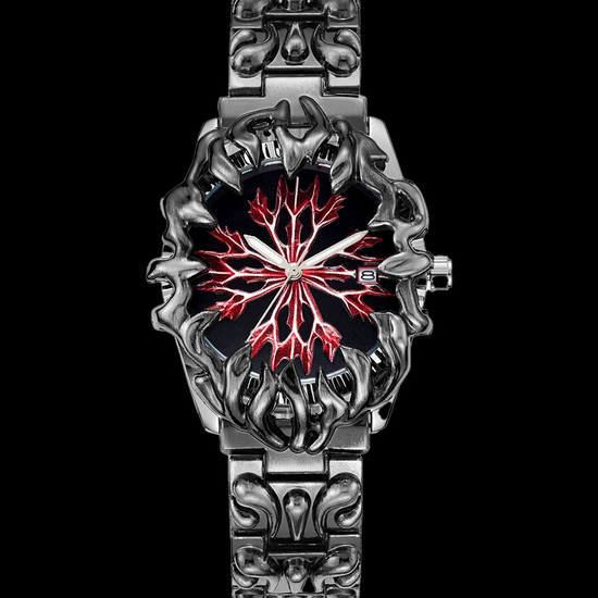 This claw-forged timepiece grips a blood-red dial in a skeletal armor frame, blending brutal elegance with alien aesthetics. Featuring a mirrored metal strap, sharp fang-like lugs, and a date display at 3 o’clock, it’s a weaponized accessory for those who dress to disrupt.