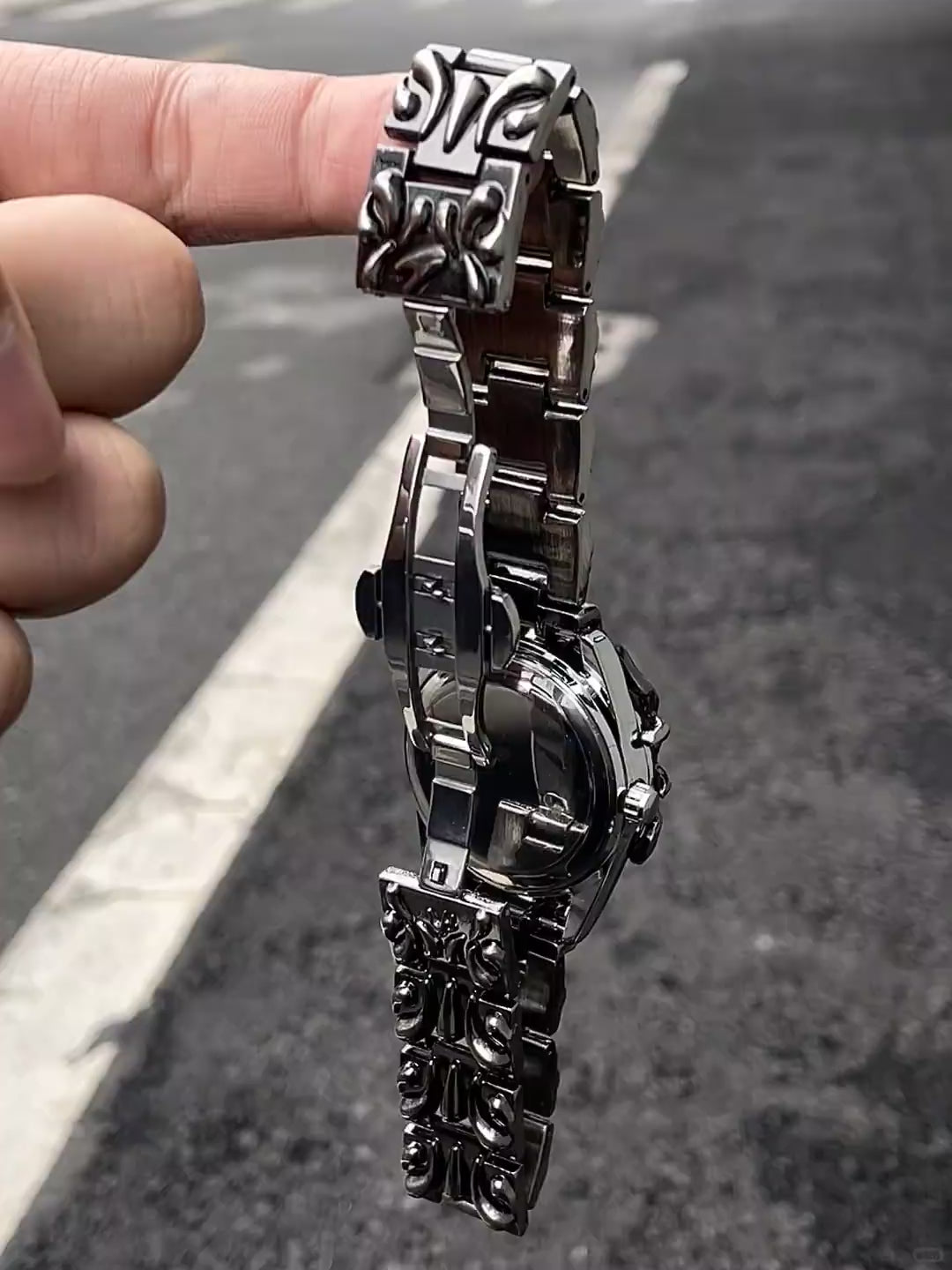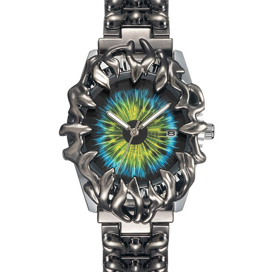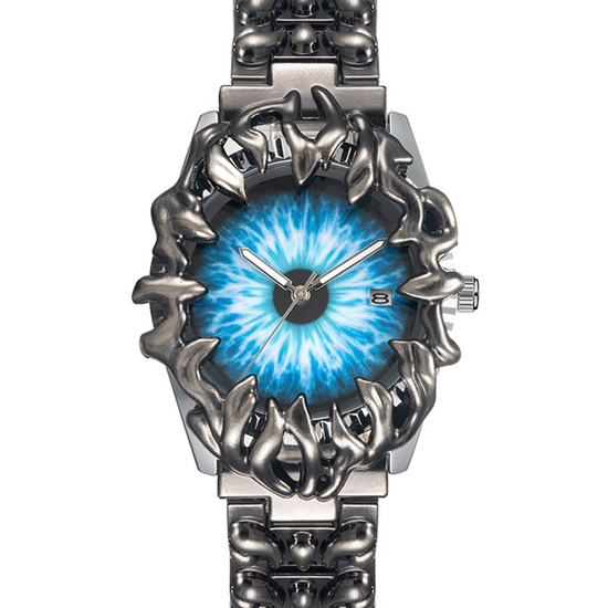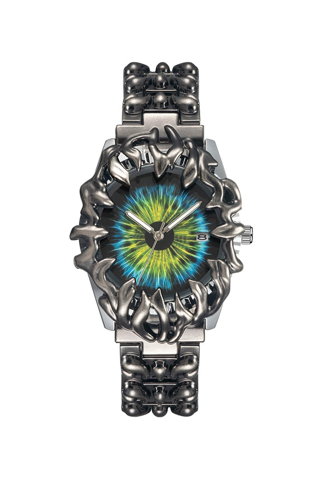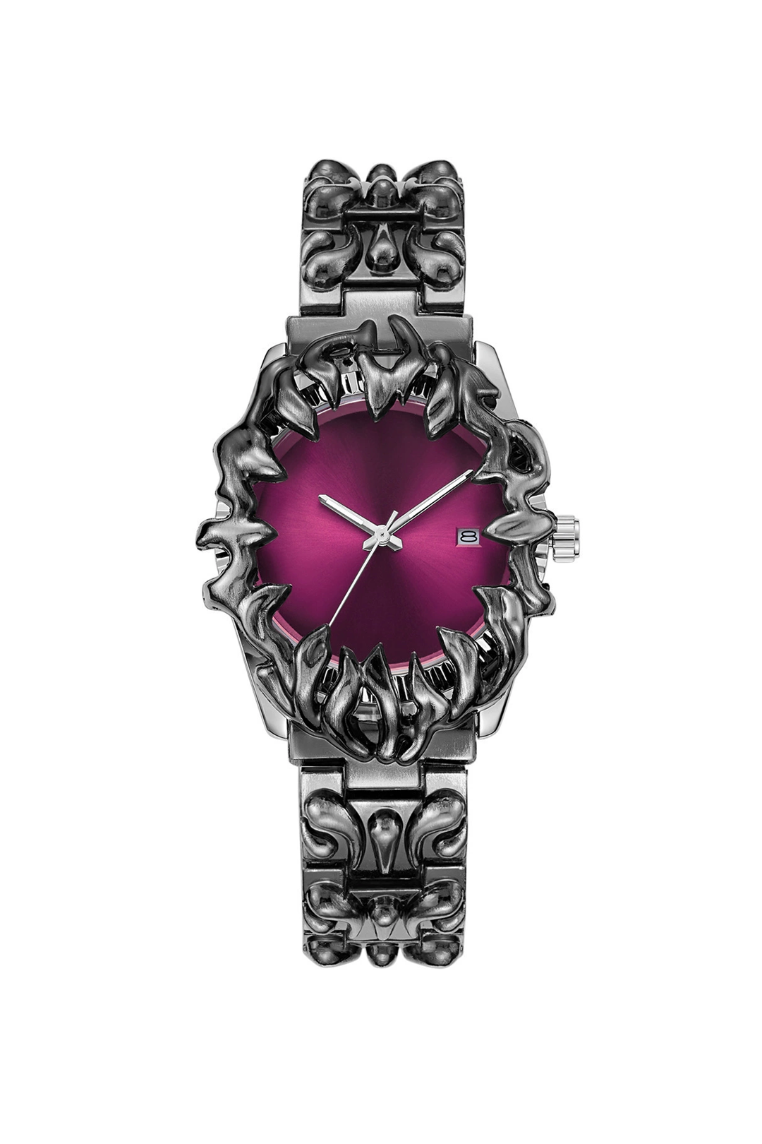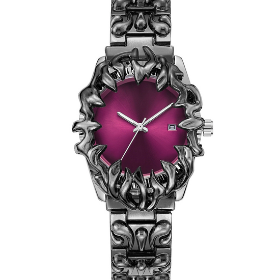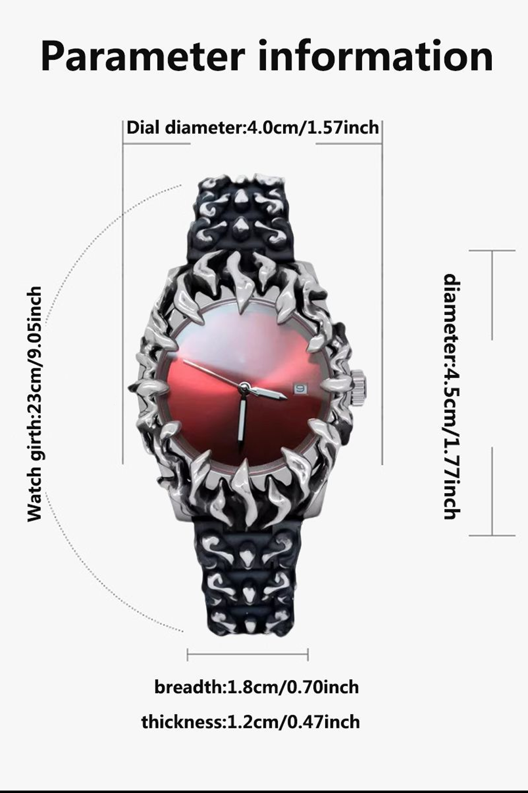 This claw-forged timepiece grips a blood-red dial in a skeletal armor frame, blending brutal elegance with alien aesthetics. Featuring a mirrored metal strap, sharp fang-like lugs, and a date display at 3 o’clock, it’s a weaponized accessory for those who dress to disrupt.