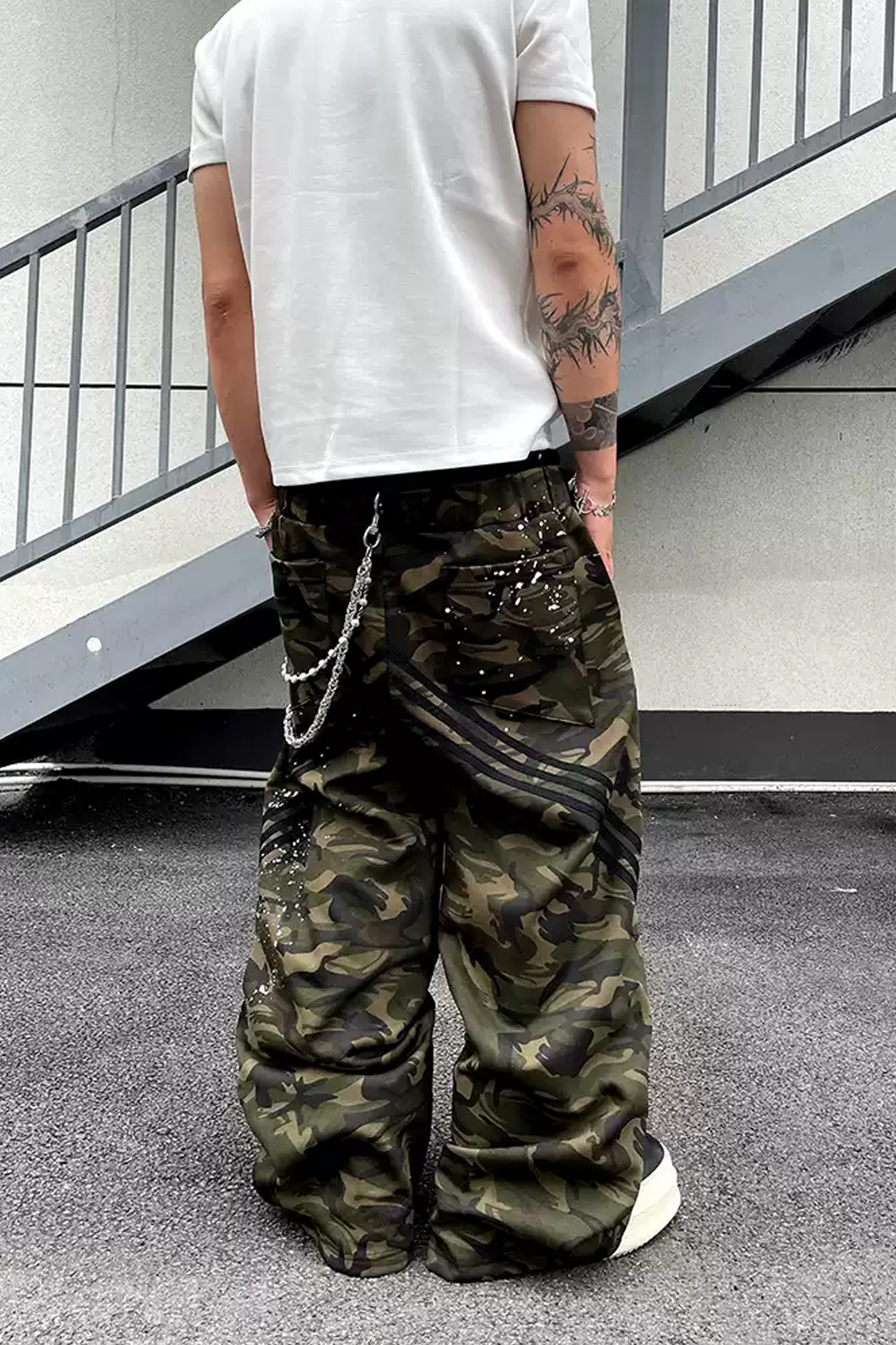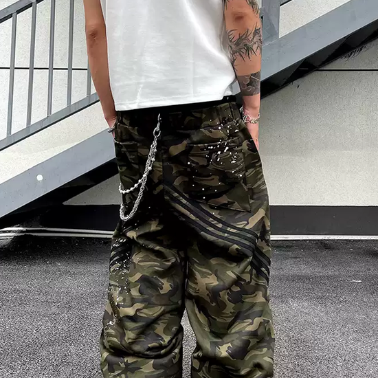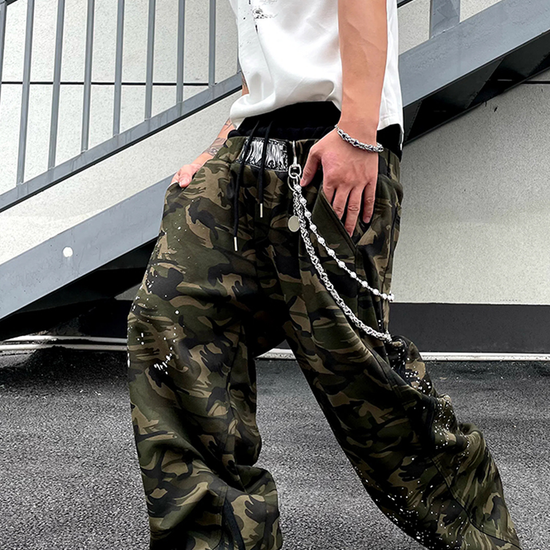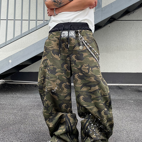 - Design Elements: Double waistband, camo print, graffiti splatter, oversized fit