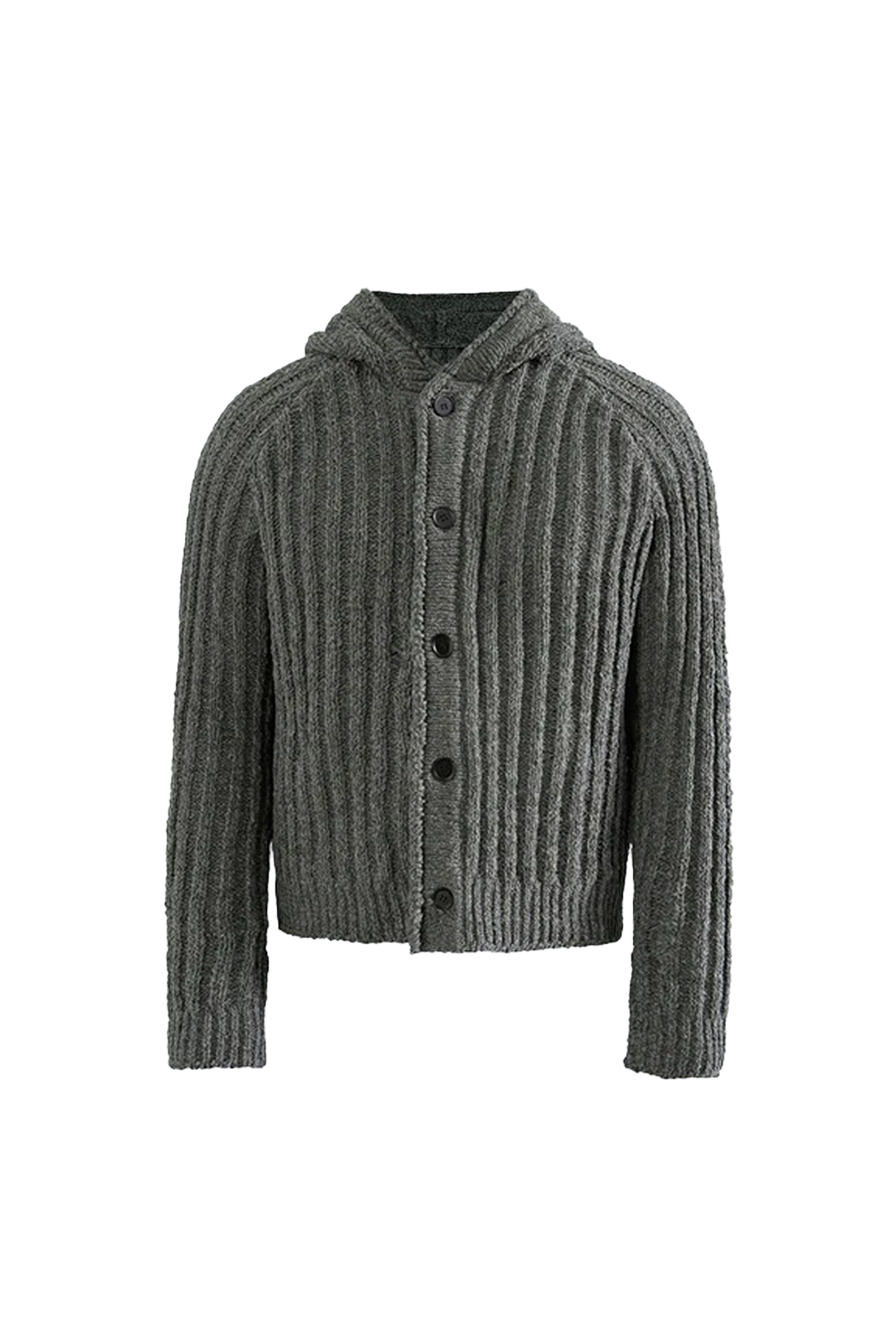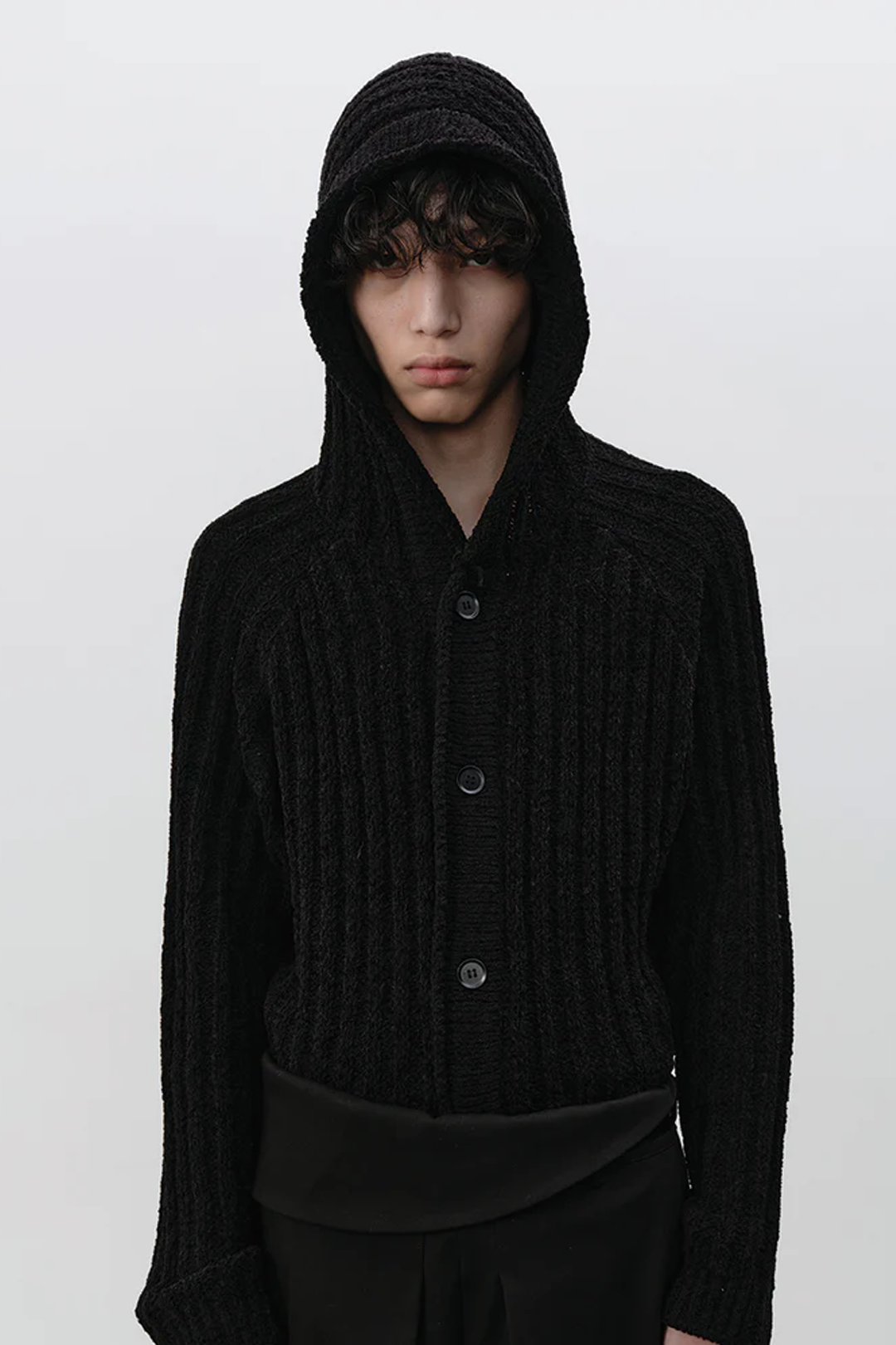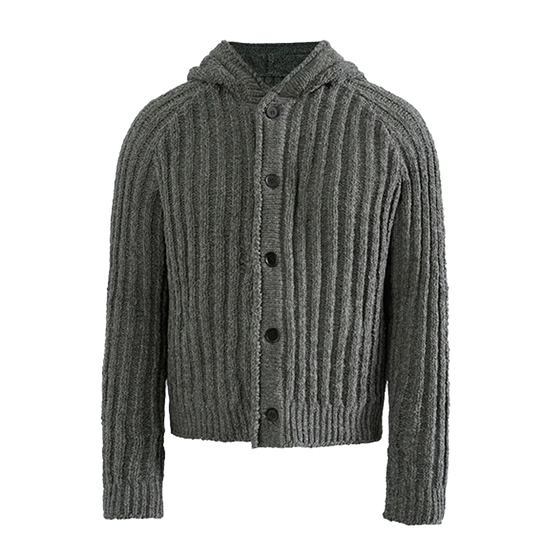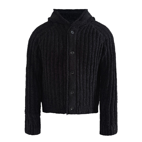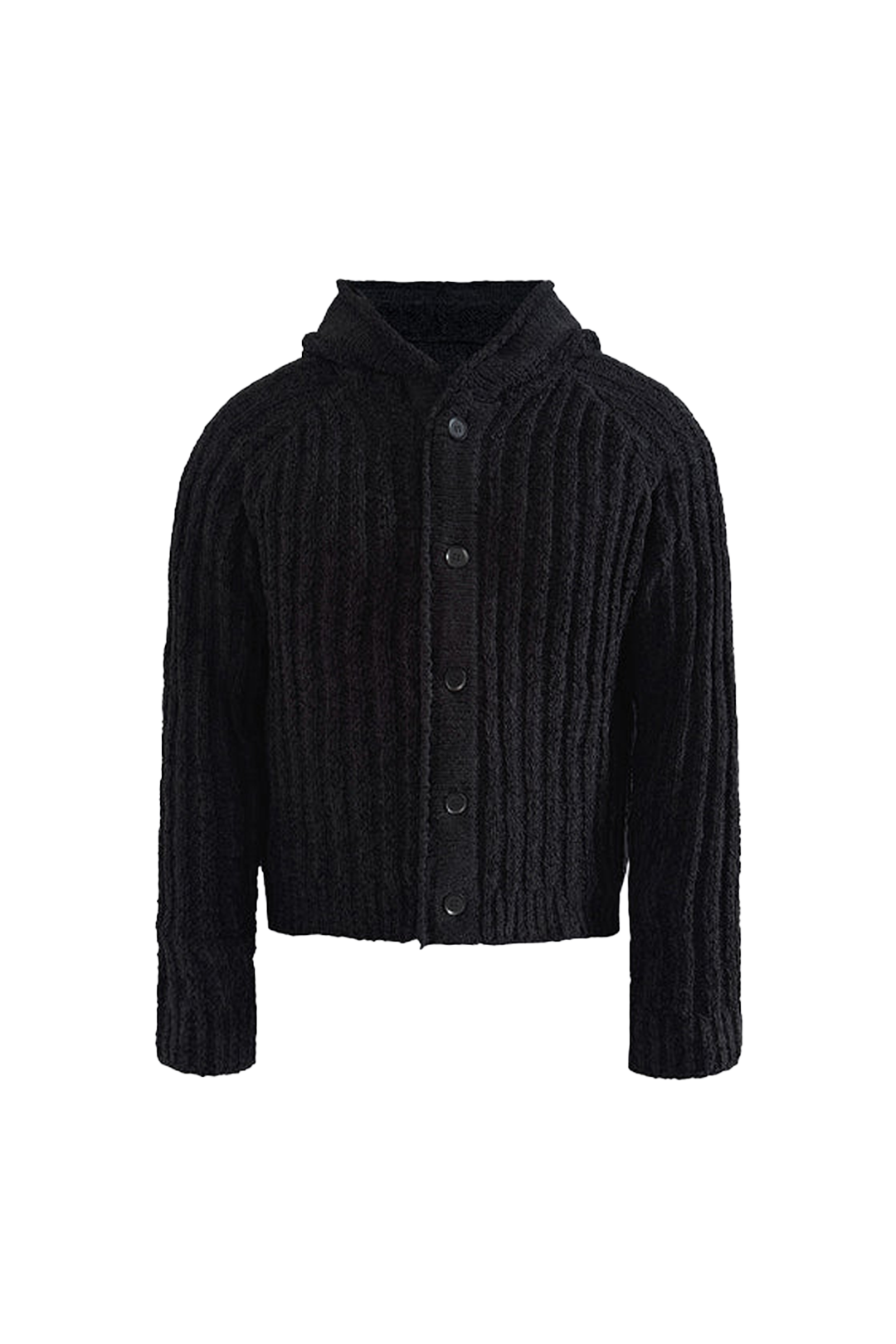 - Design Elements: Chunky vertical rib knit, button-front, hooded, cropped boxy silhouette, long sleeves