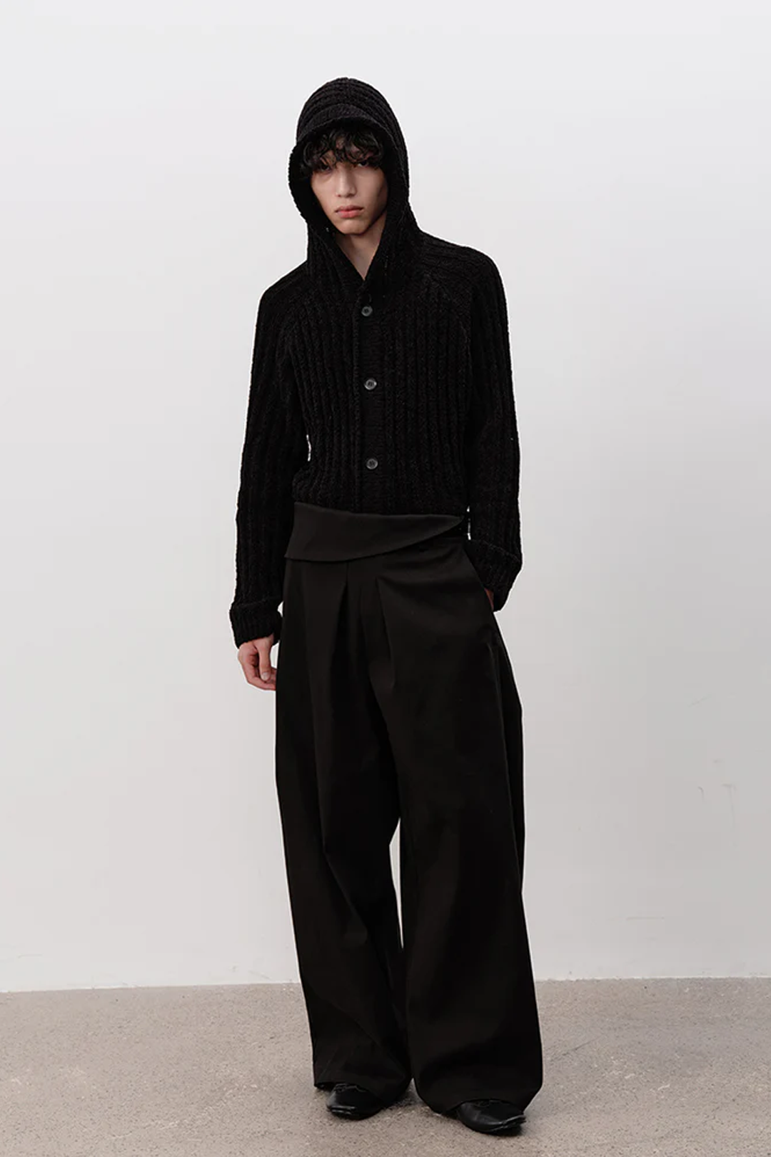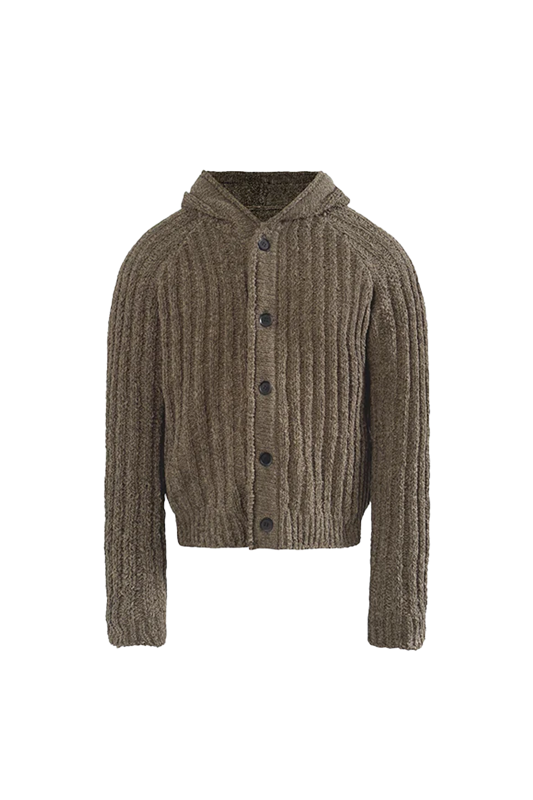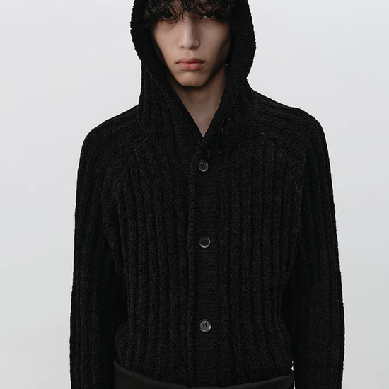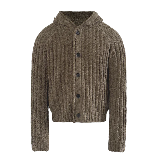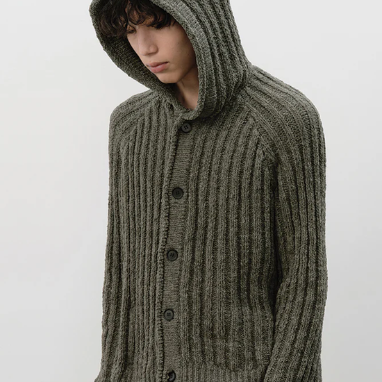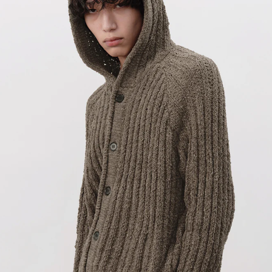 - Design Elements: Chunky vertical rib knit, button-front, hooded, cropped boxy silhouette, long sleeves