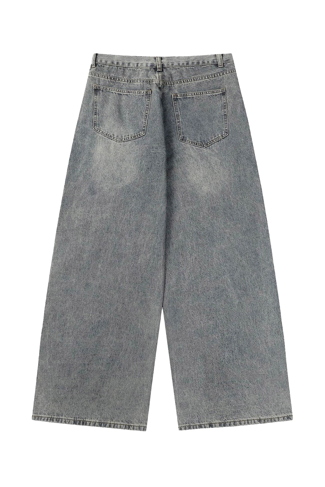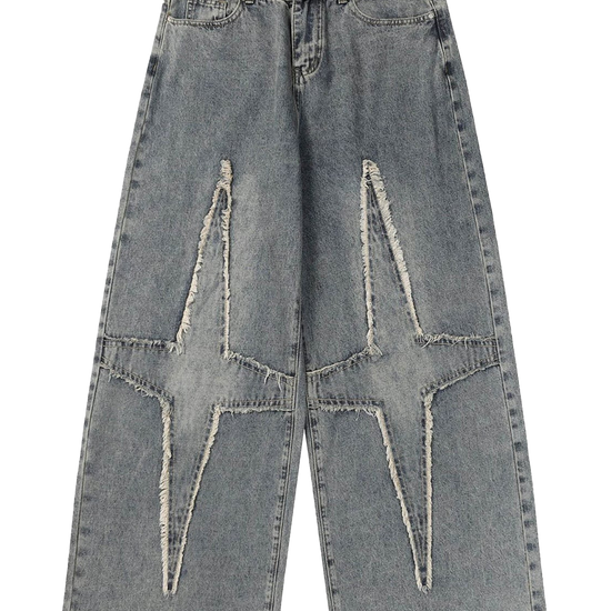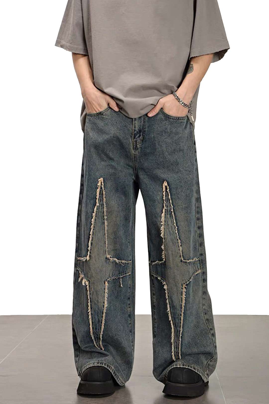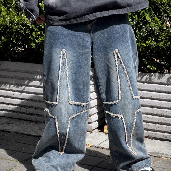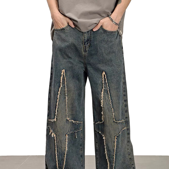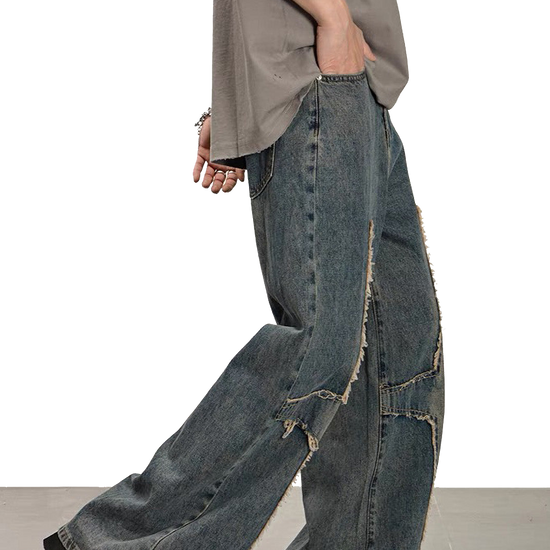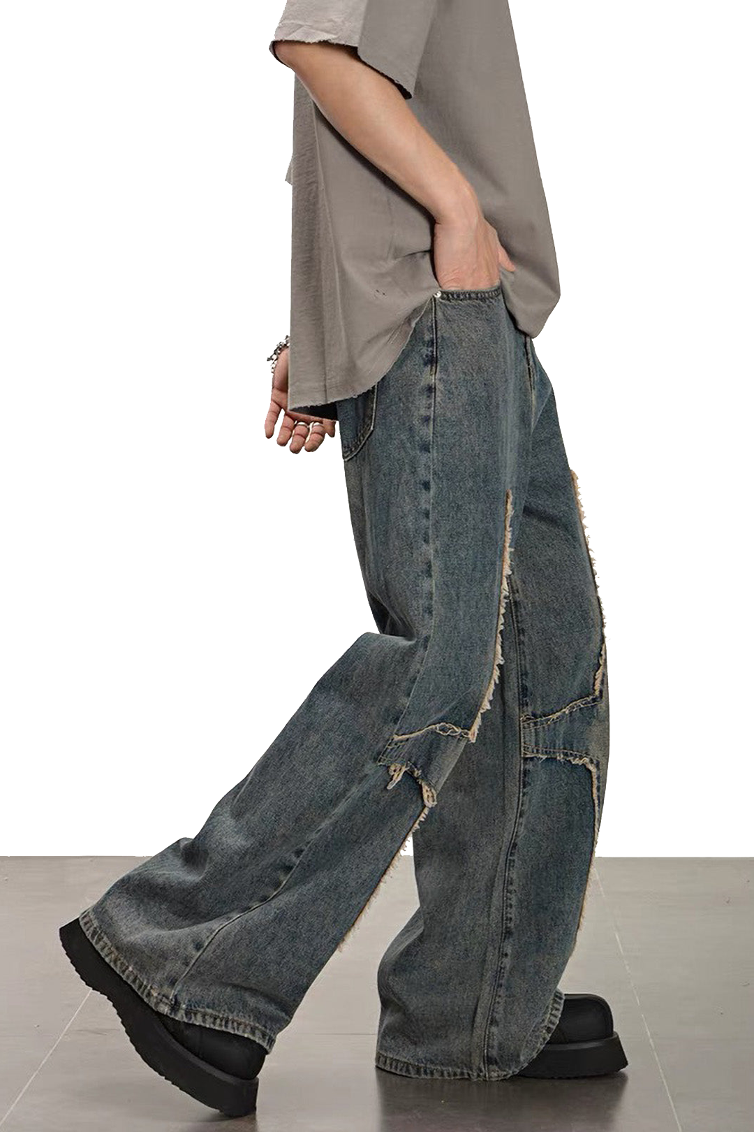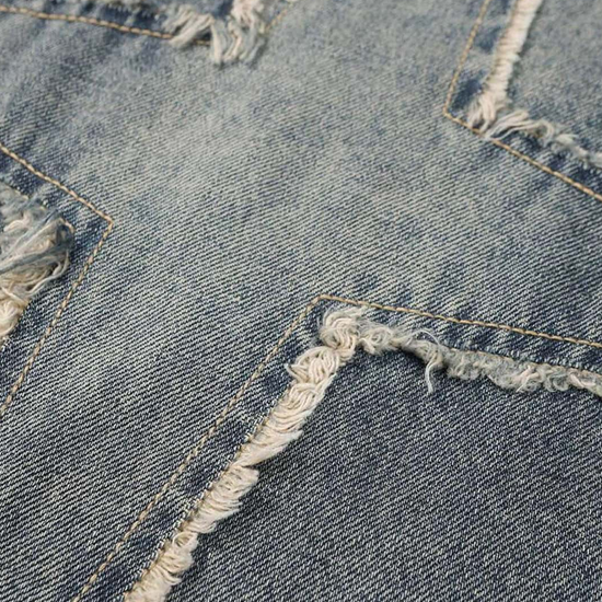 - Design Elements: Oversized cross-shaped patchwork, distressed edges, wide-leg fit