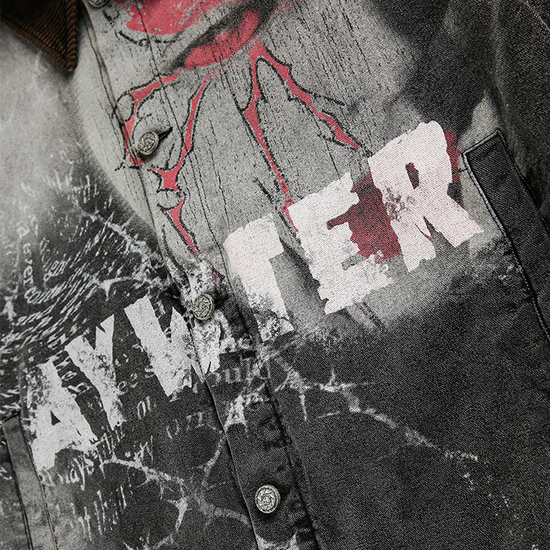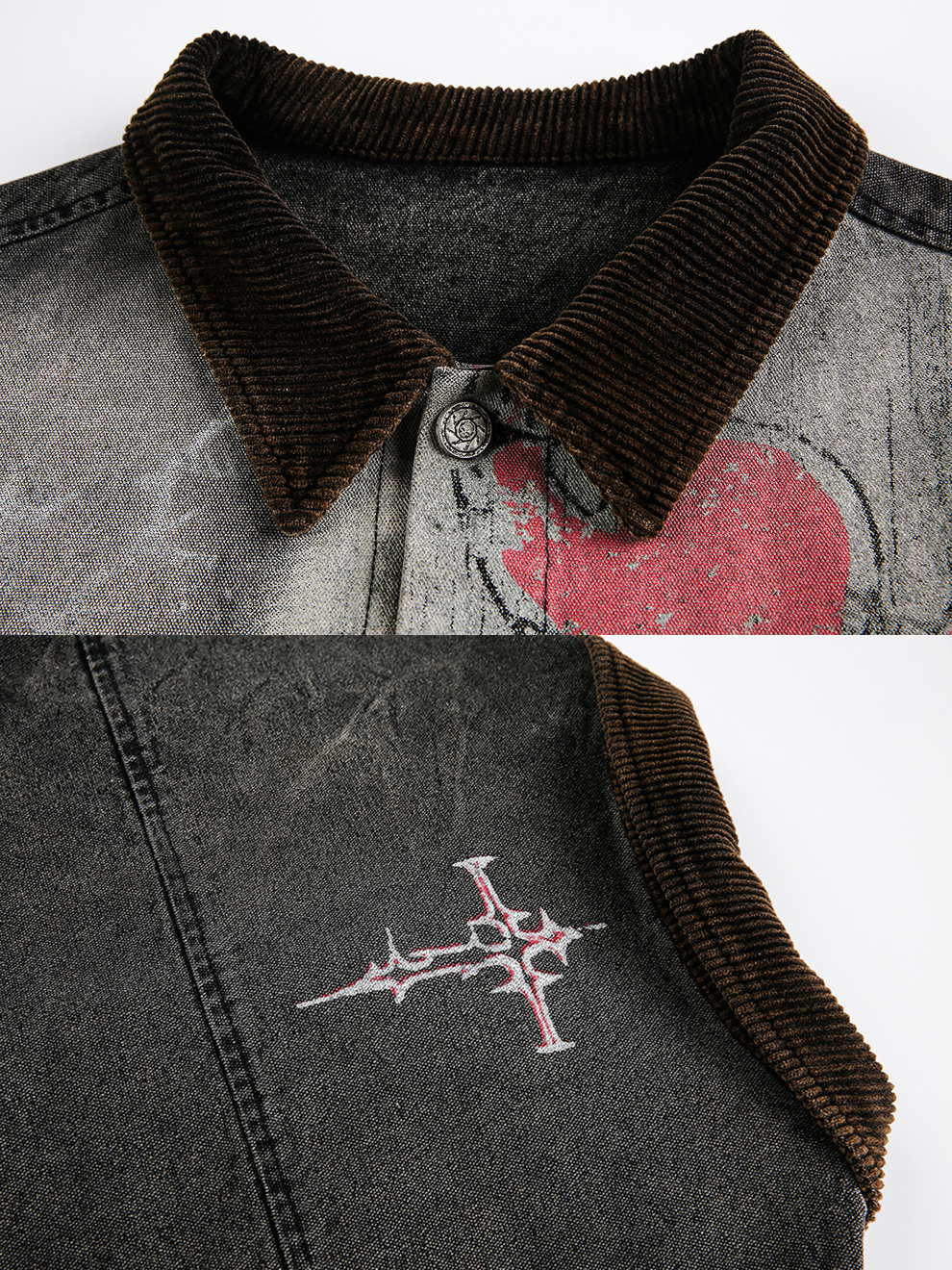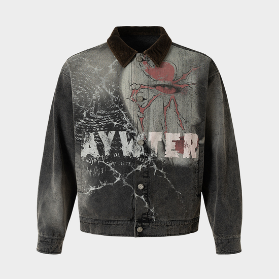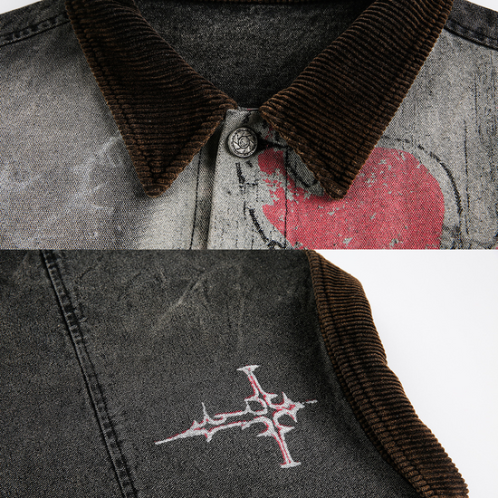 - Design Elements: Washed denim base with graffiti print, cracked effect, contrast corduroy collar