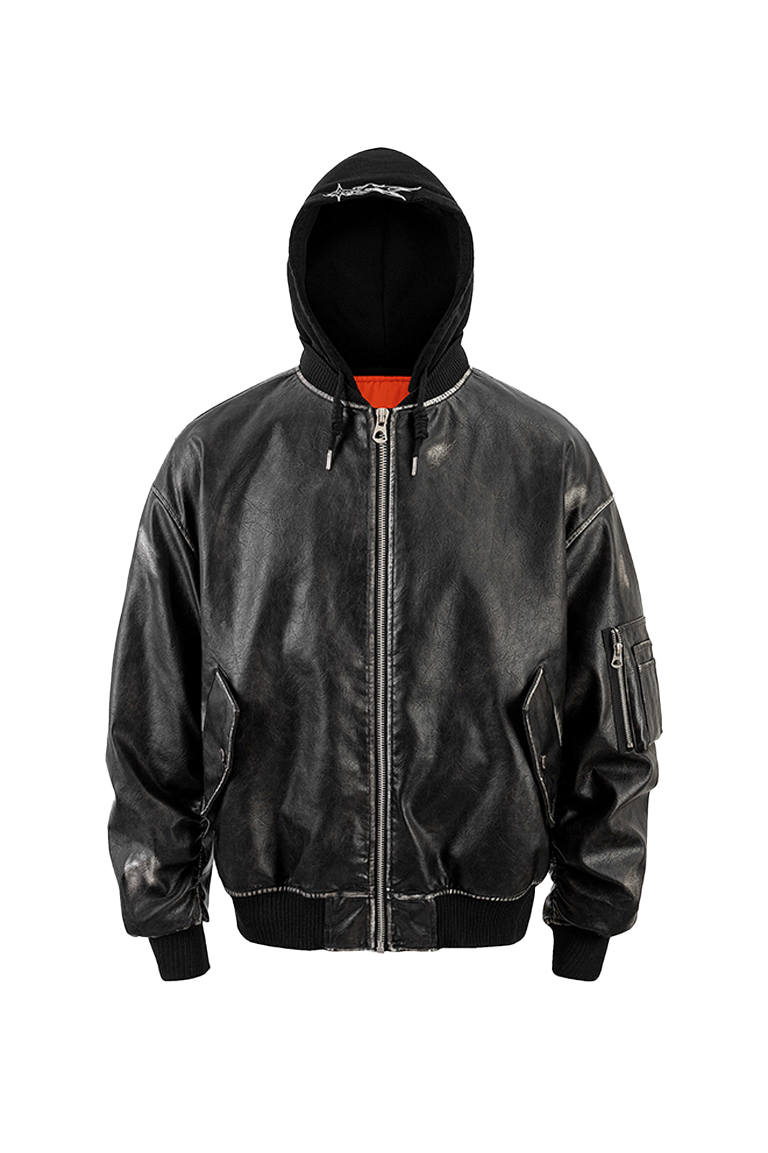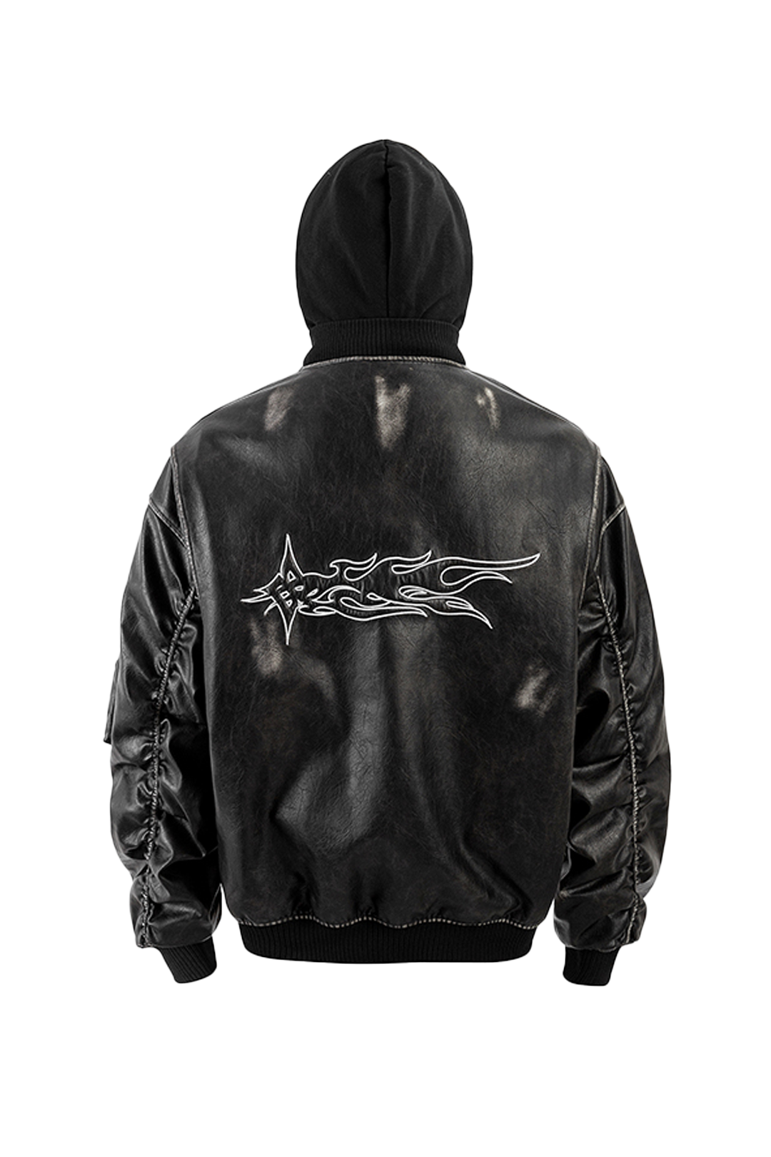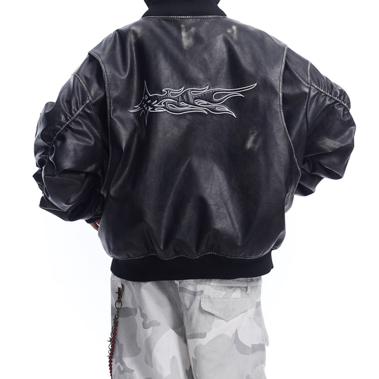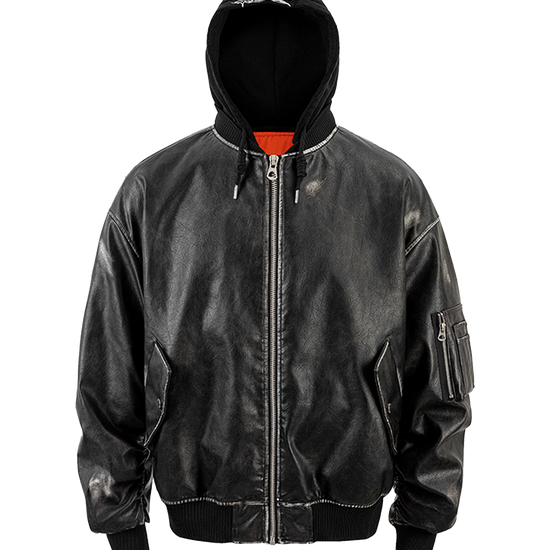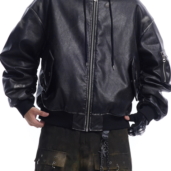 - Design Elements: Washed leather finish, detachable hood, embroidered back detail, bomber silhouette