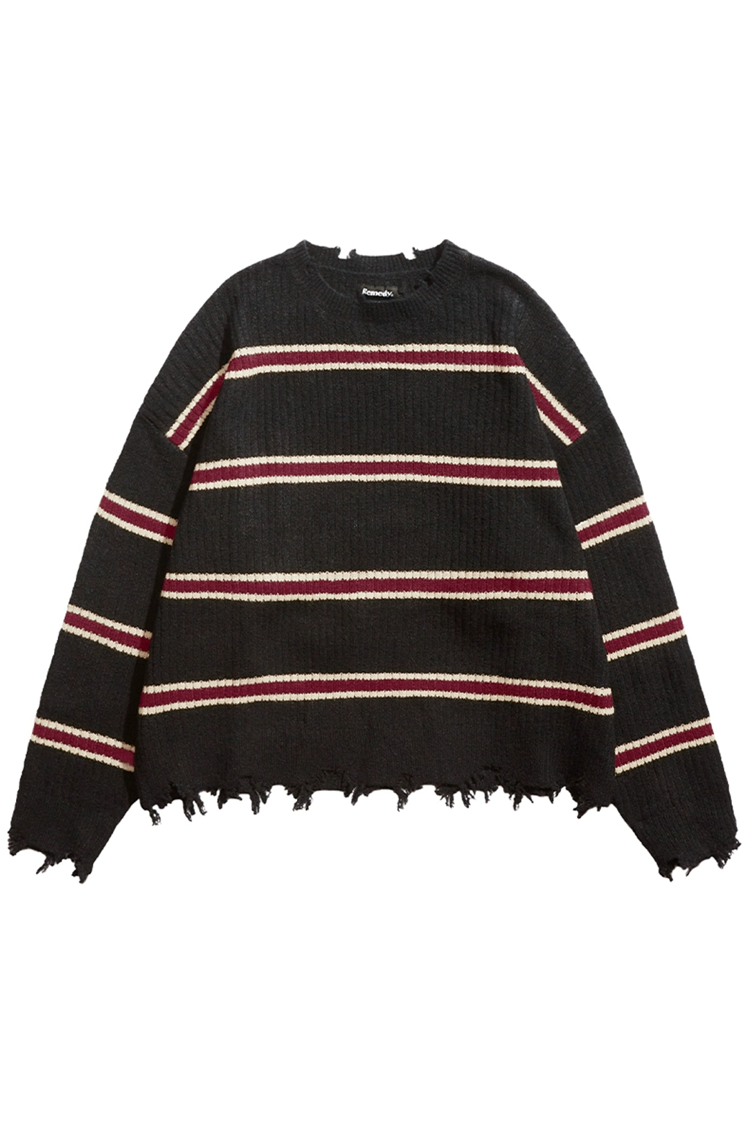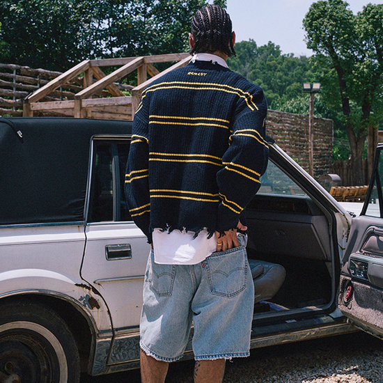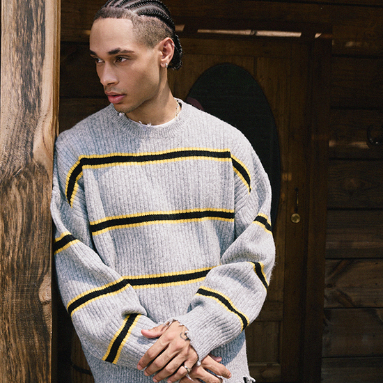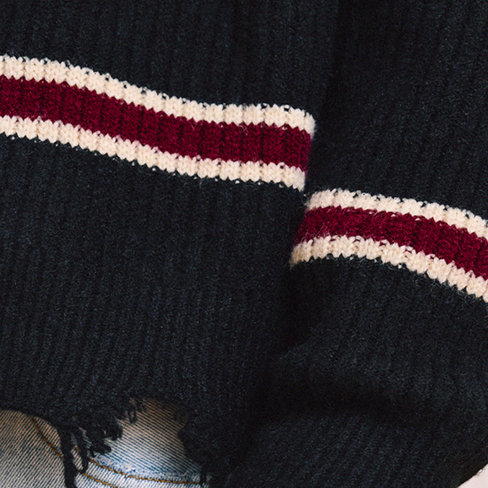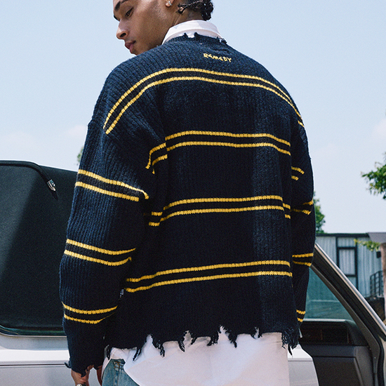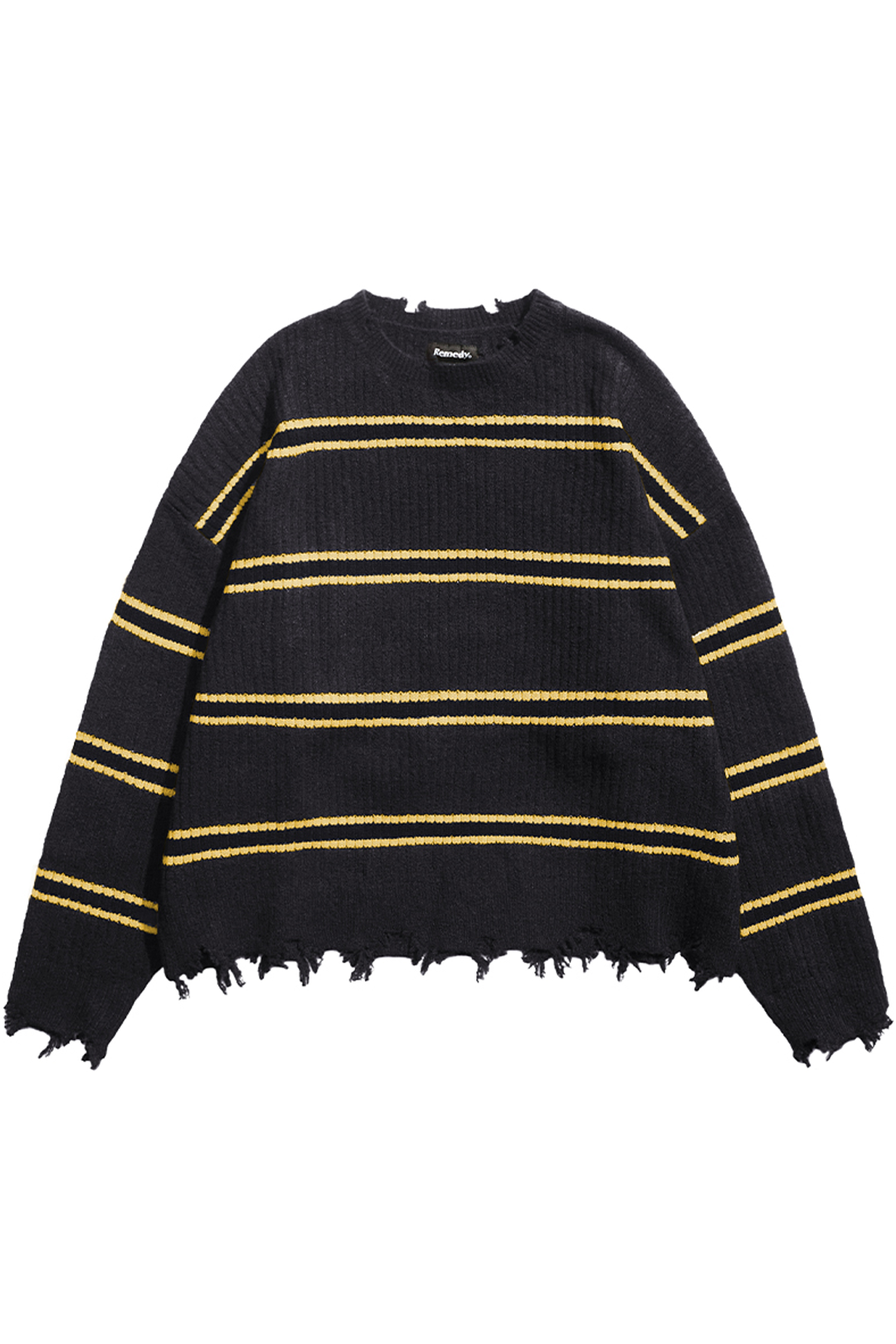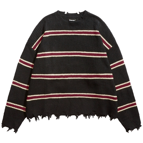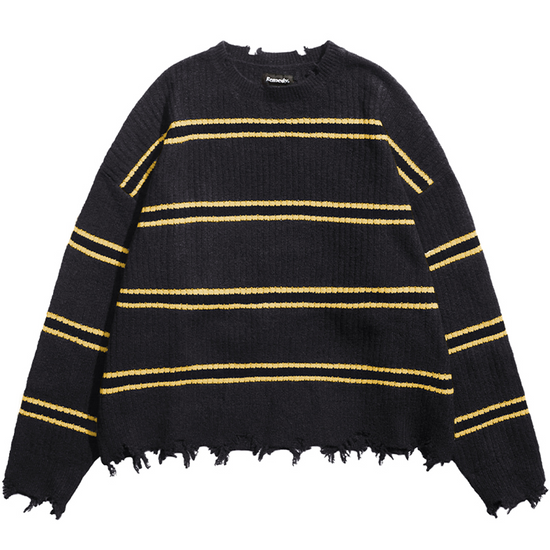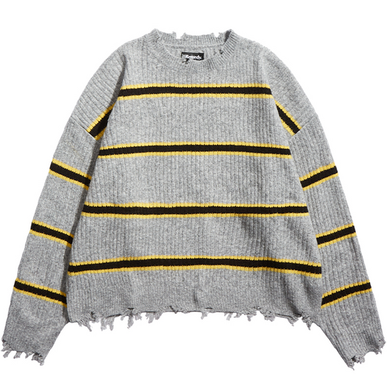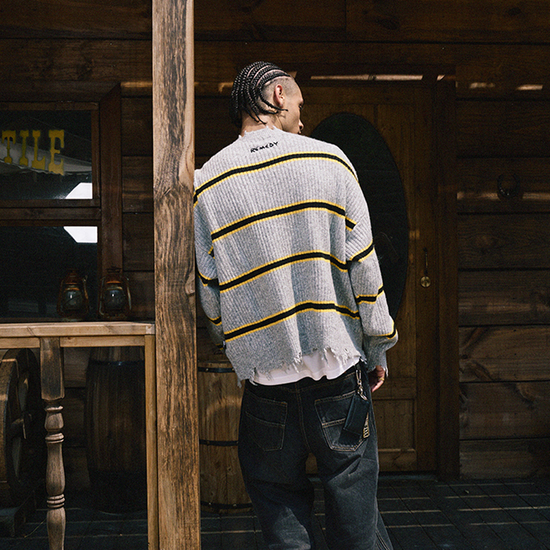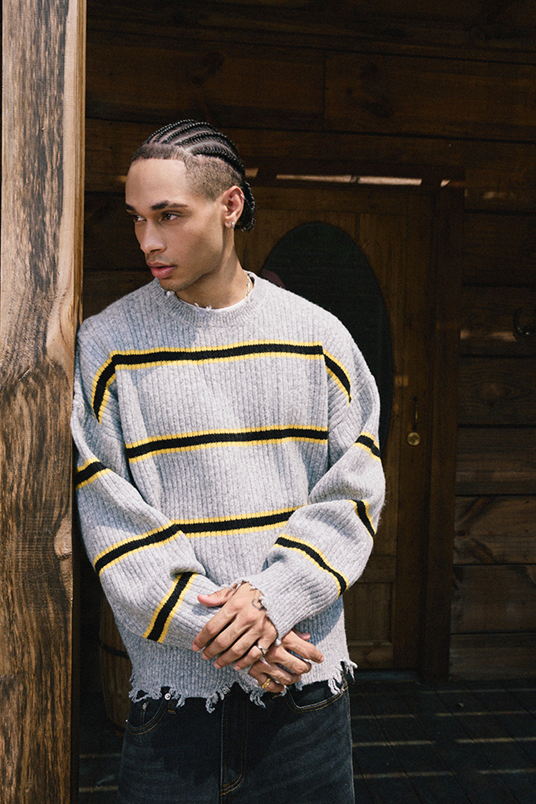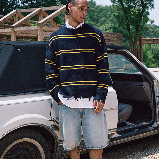 - Design Elements: Distressed hemline, striped pattern, oversized silhouette