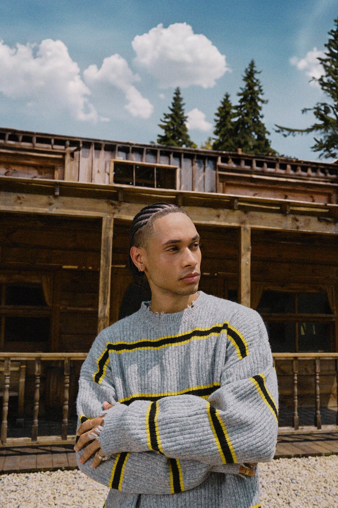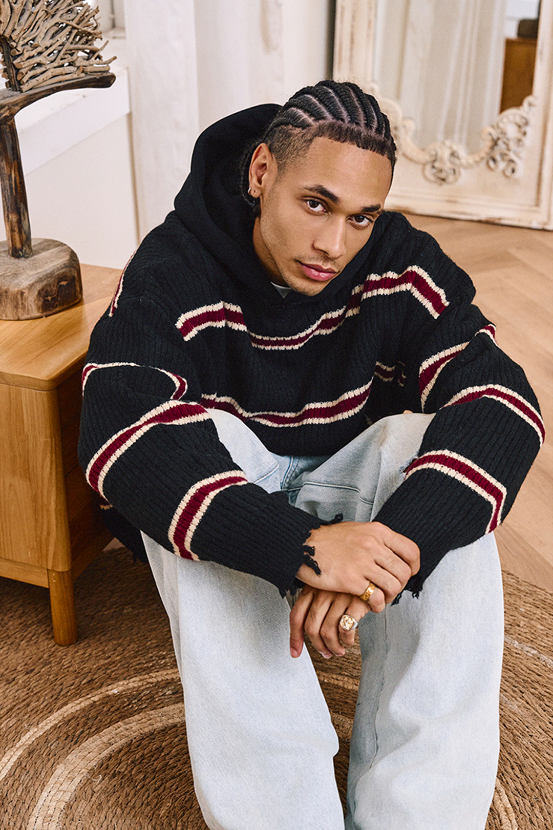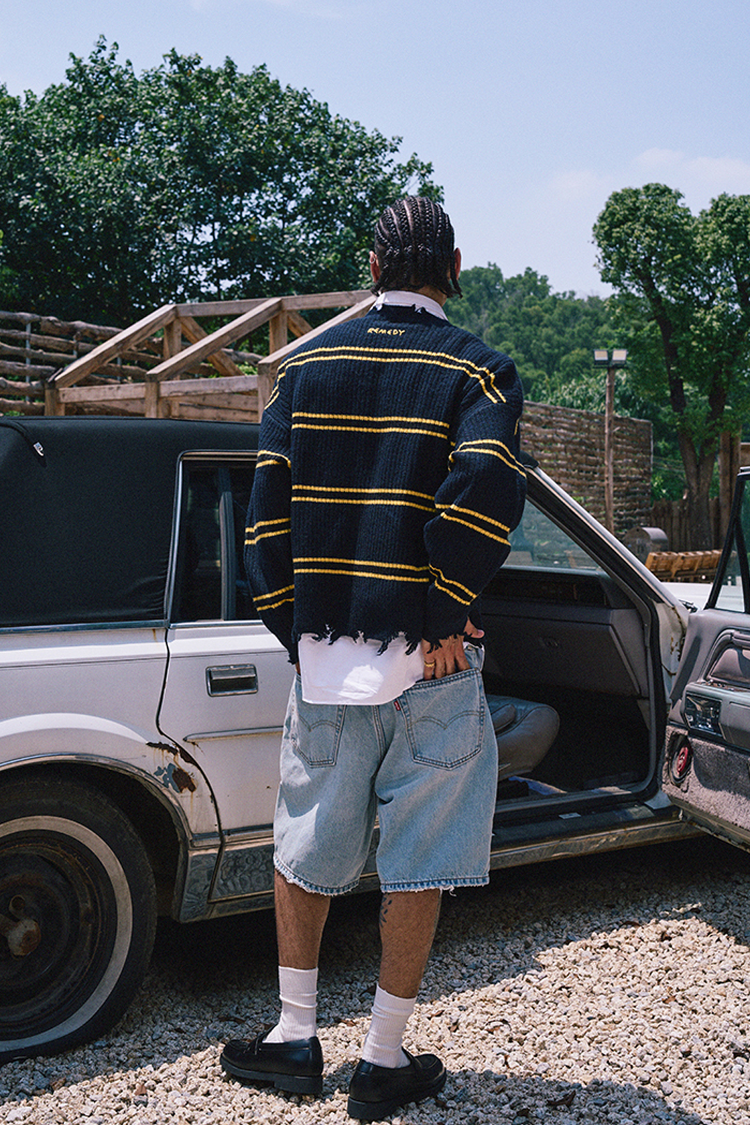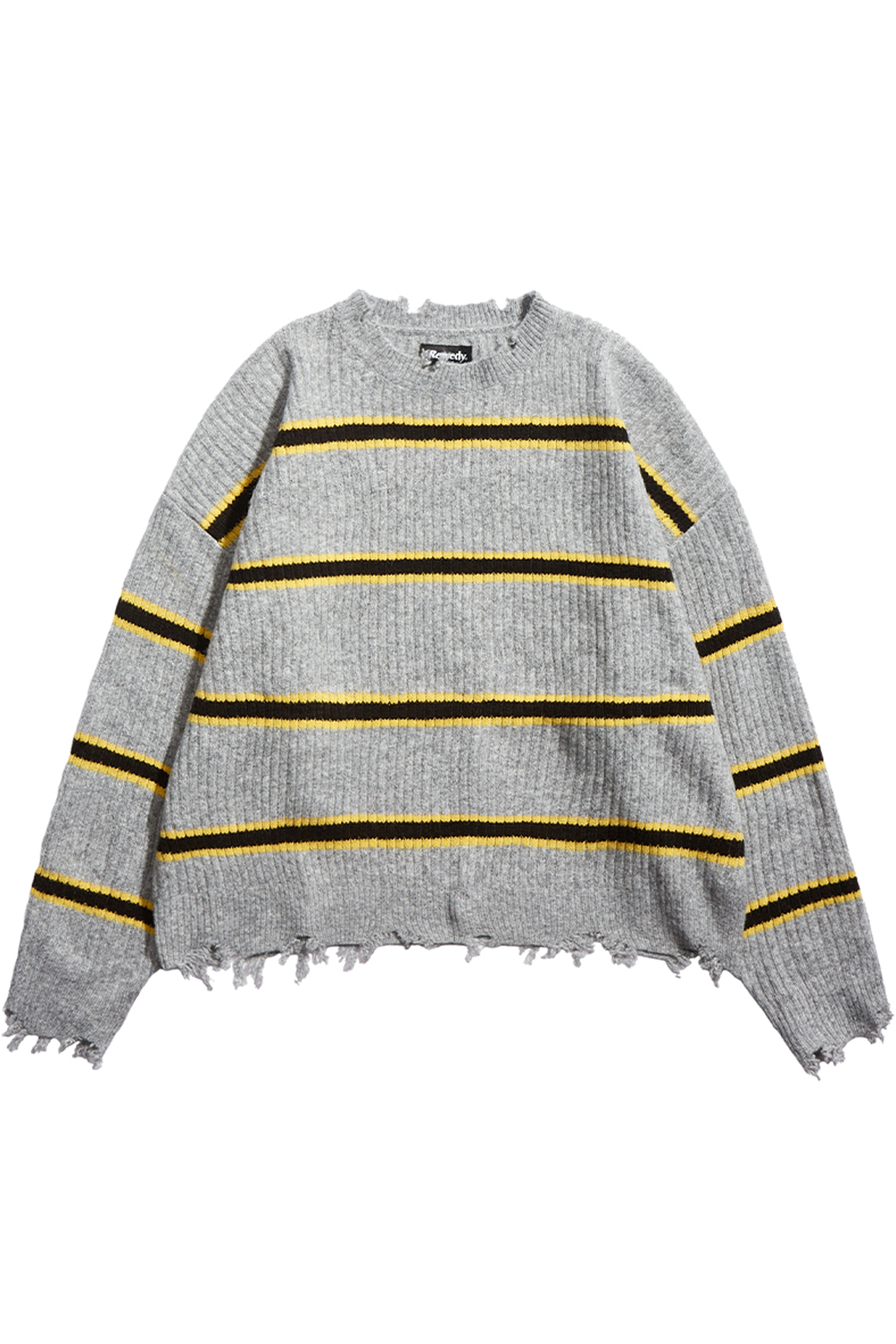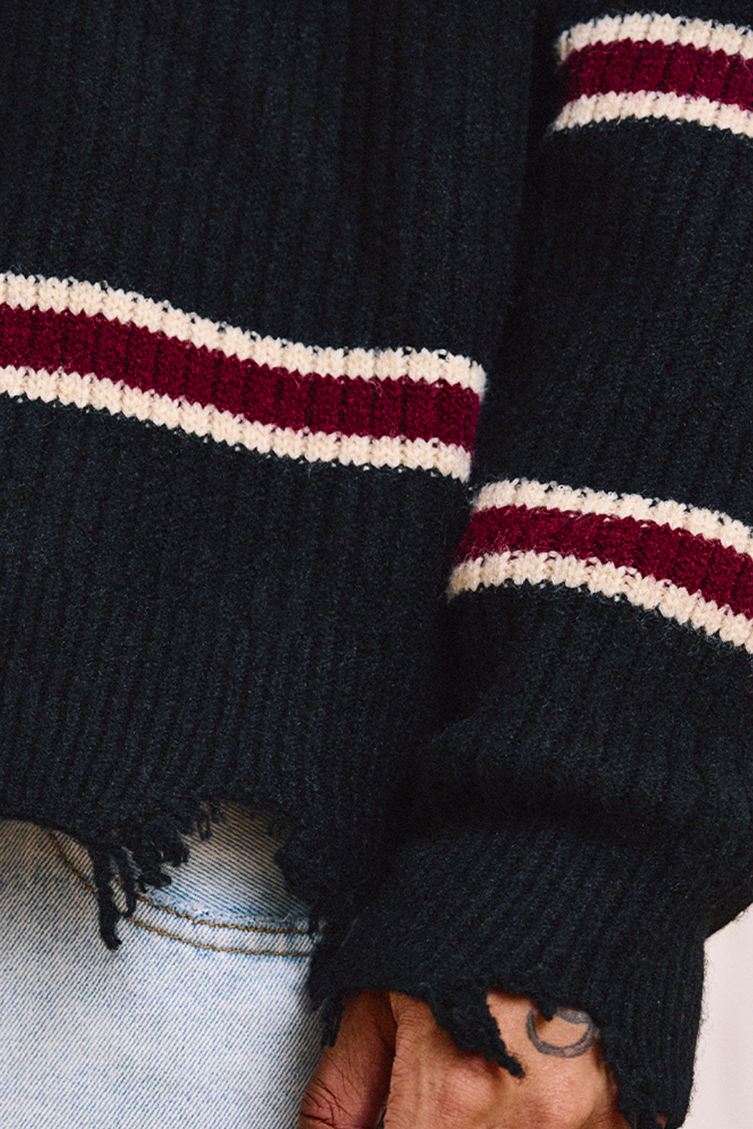 - Design Elements: Distressed hemline, striped pattern, oversized silhouette