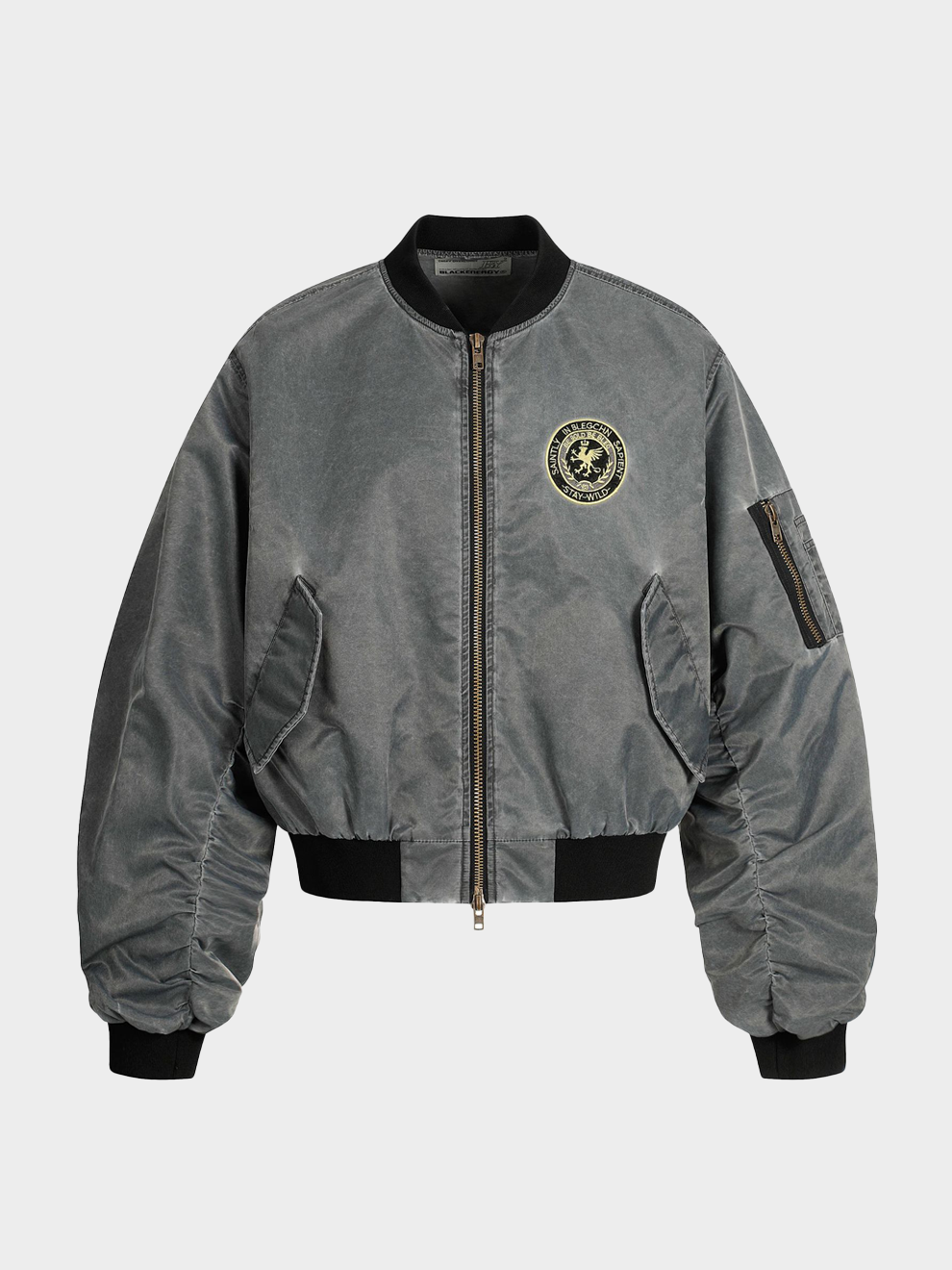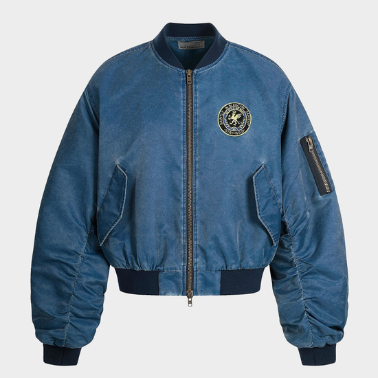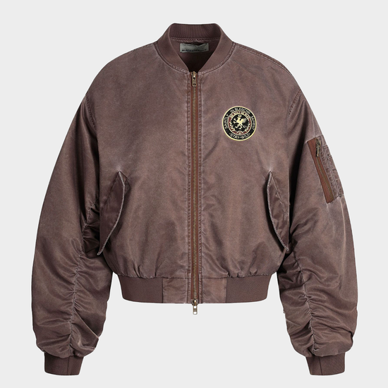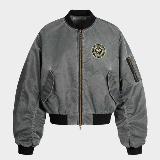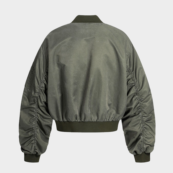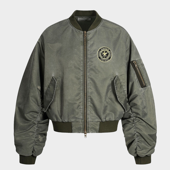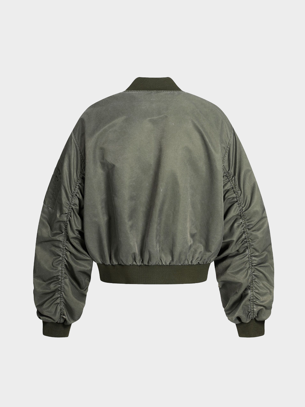 - Design Elements: Wax-dyed finish, bomber silhouette, ruched sleeves, ribbed hem and cuffs, sleeve utility pocket