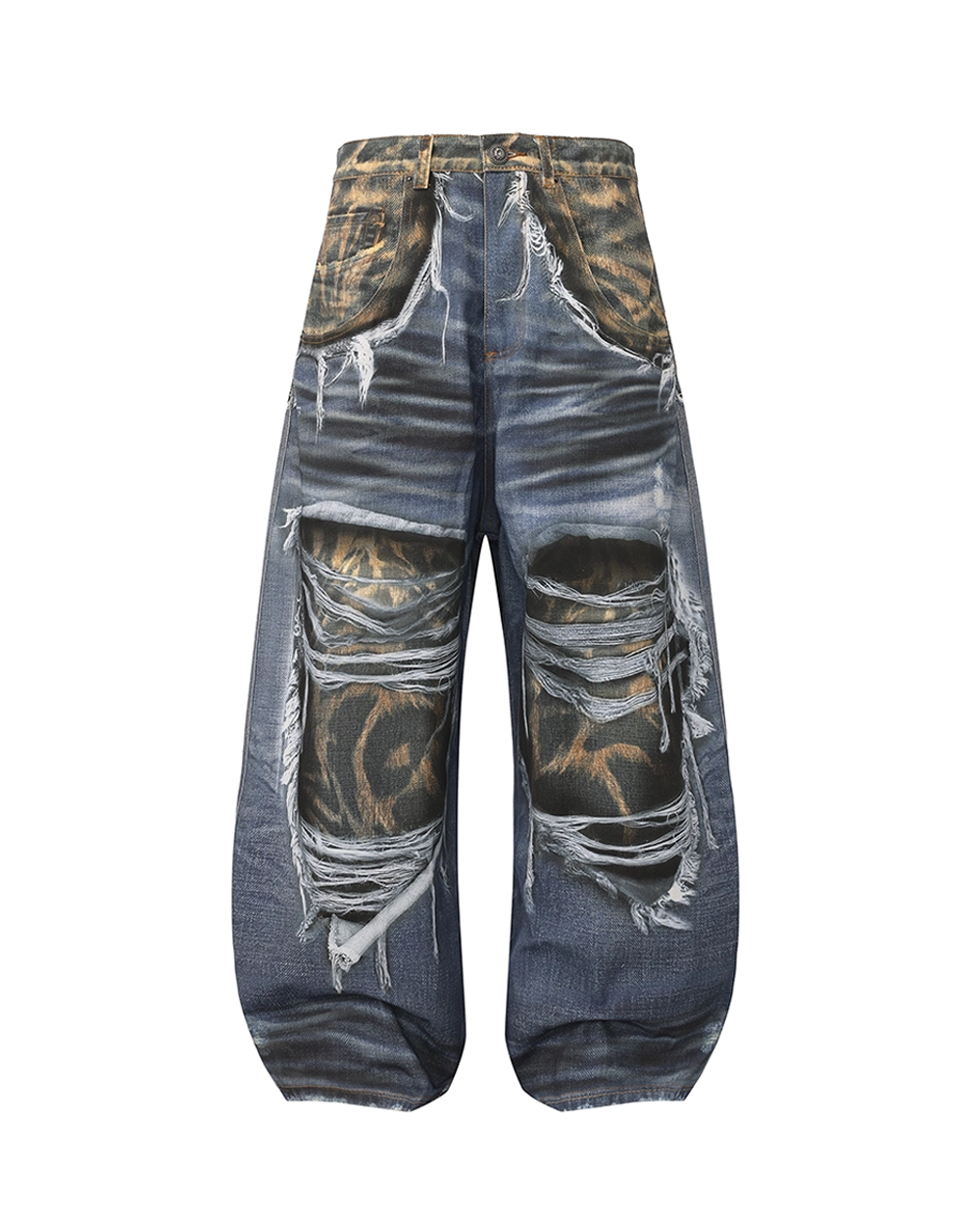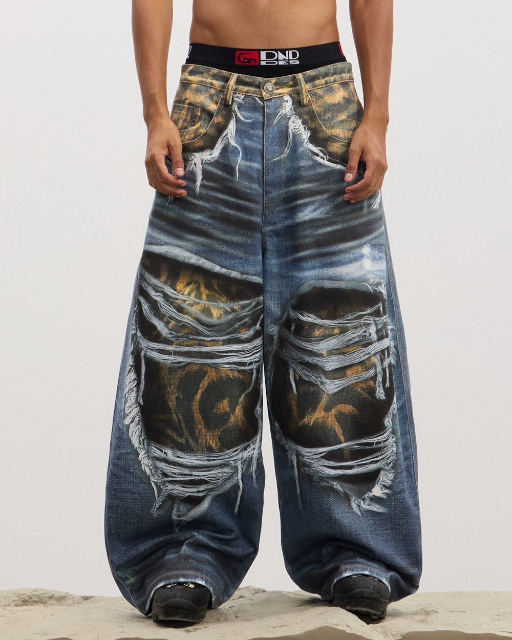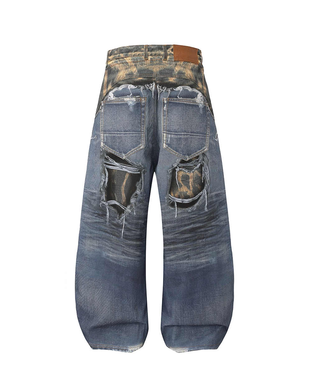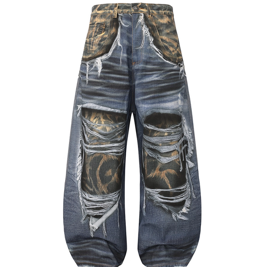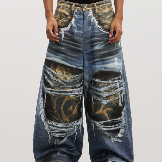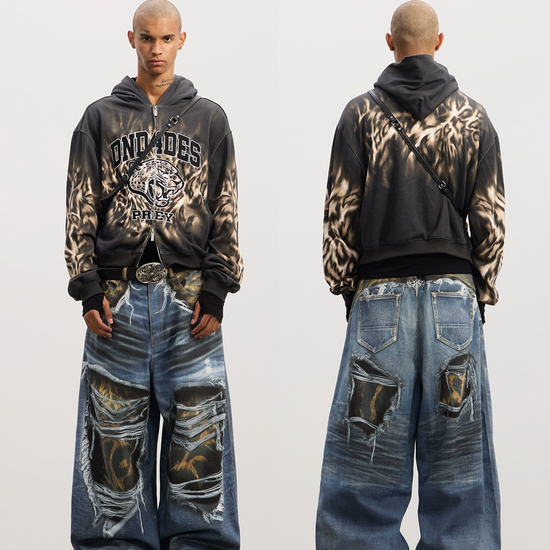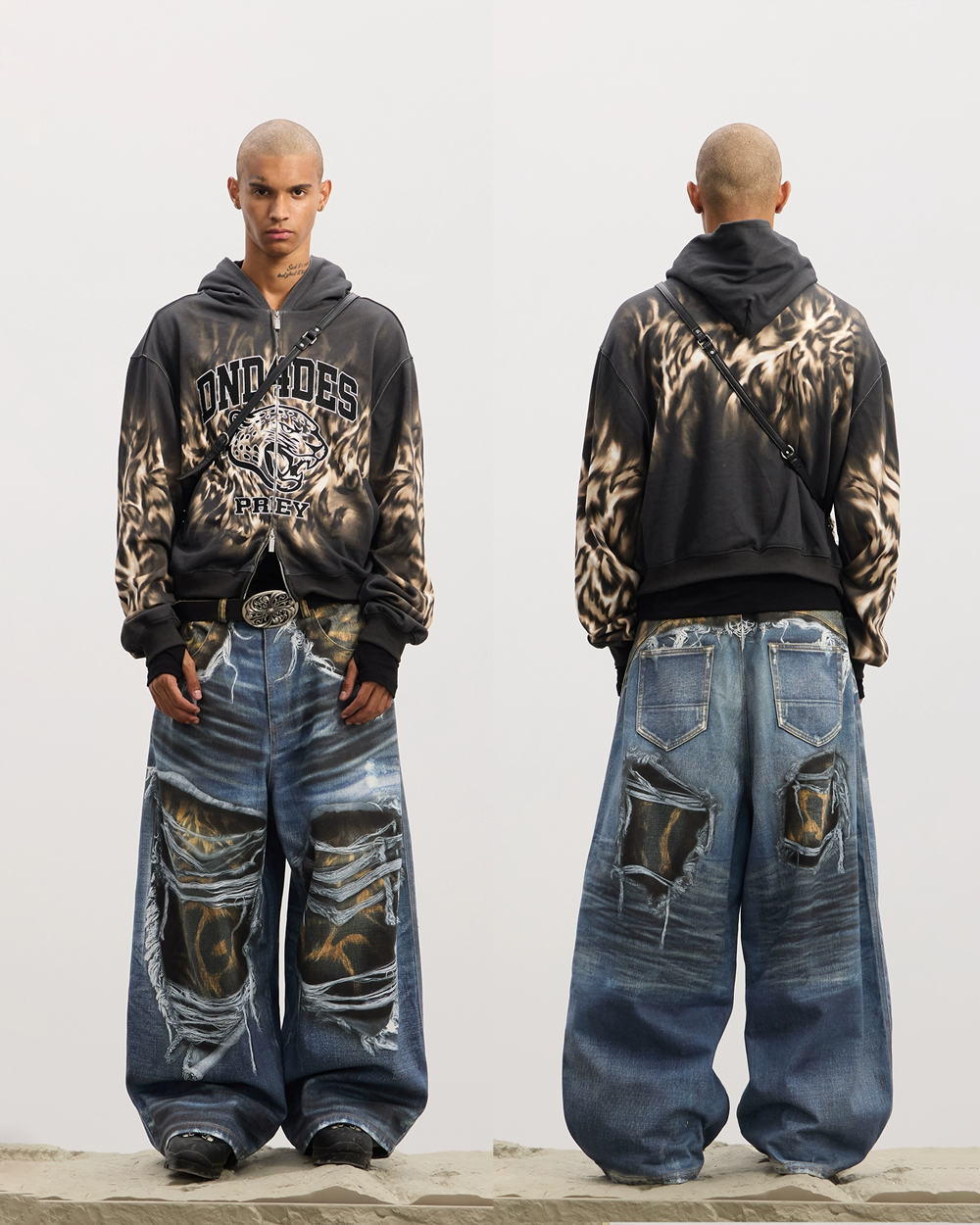 - Design Elements: Leopard wash print, distressed ripped patches, oversized baggy cut, built-in drawstring at hem