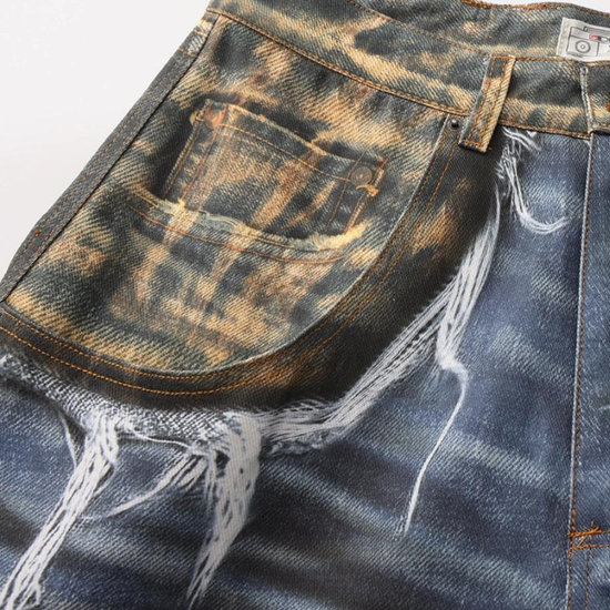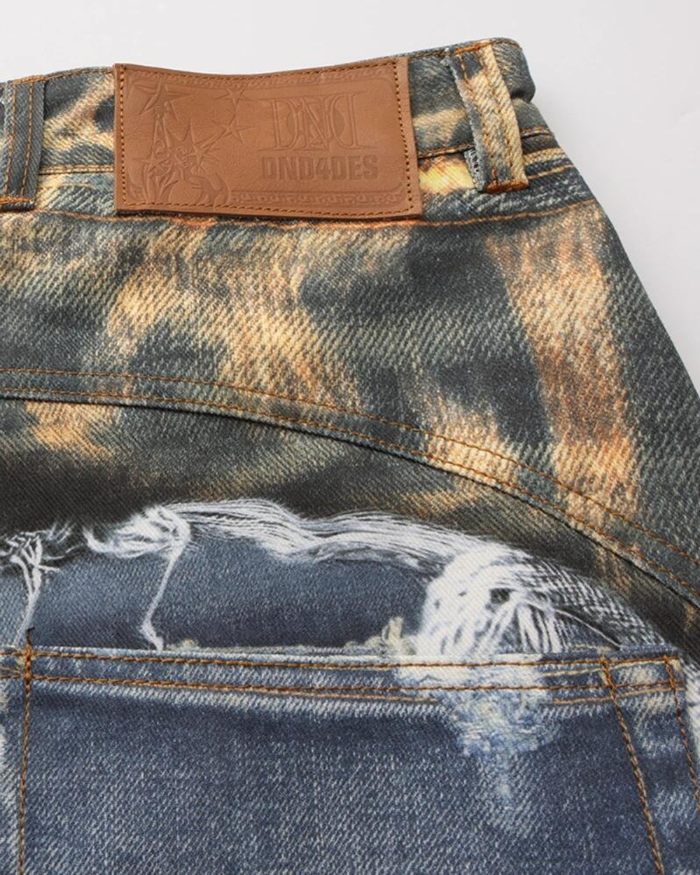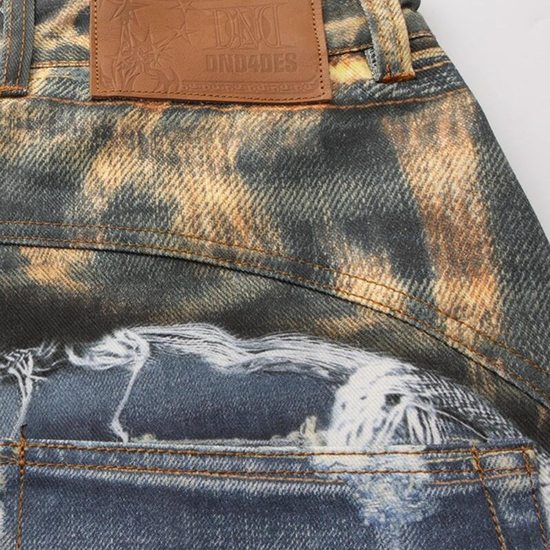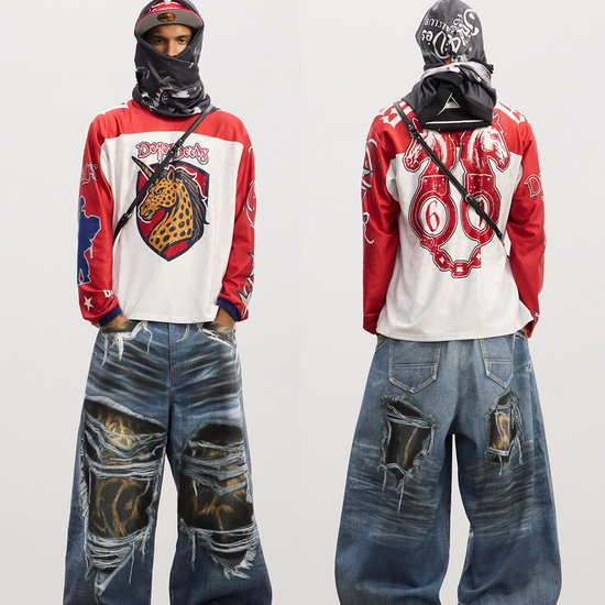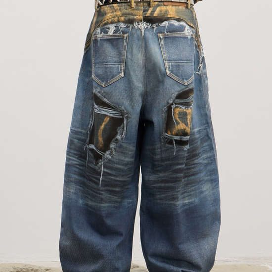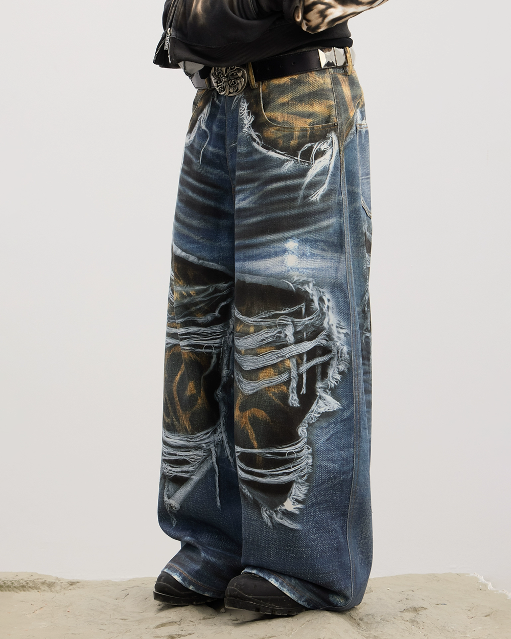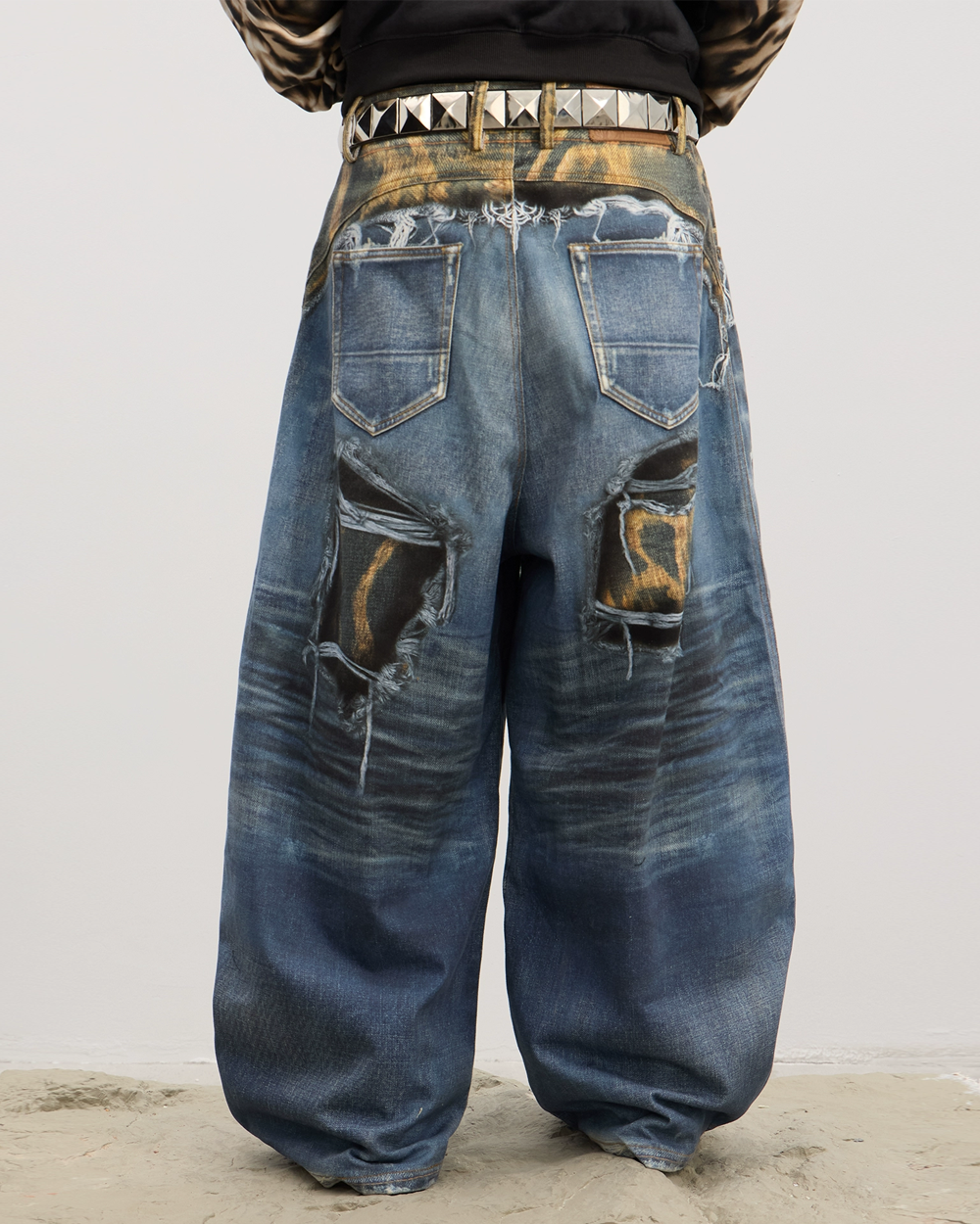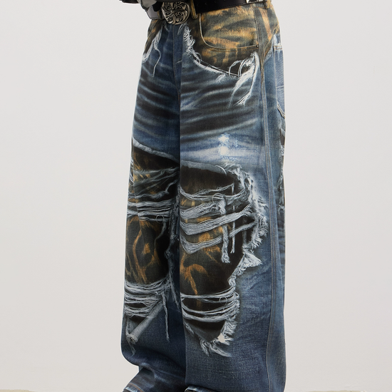 - Design Elements: Leopard wash print, distressed ripped patches, oversized baggy cut, built-in drawstring at hem