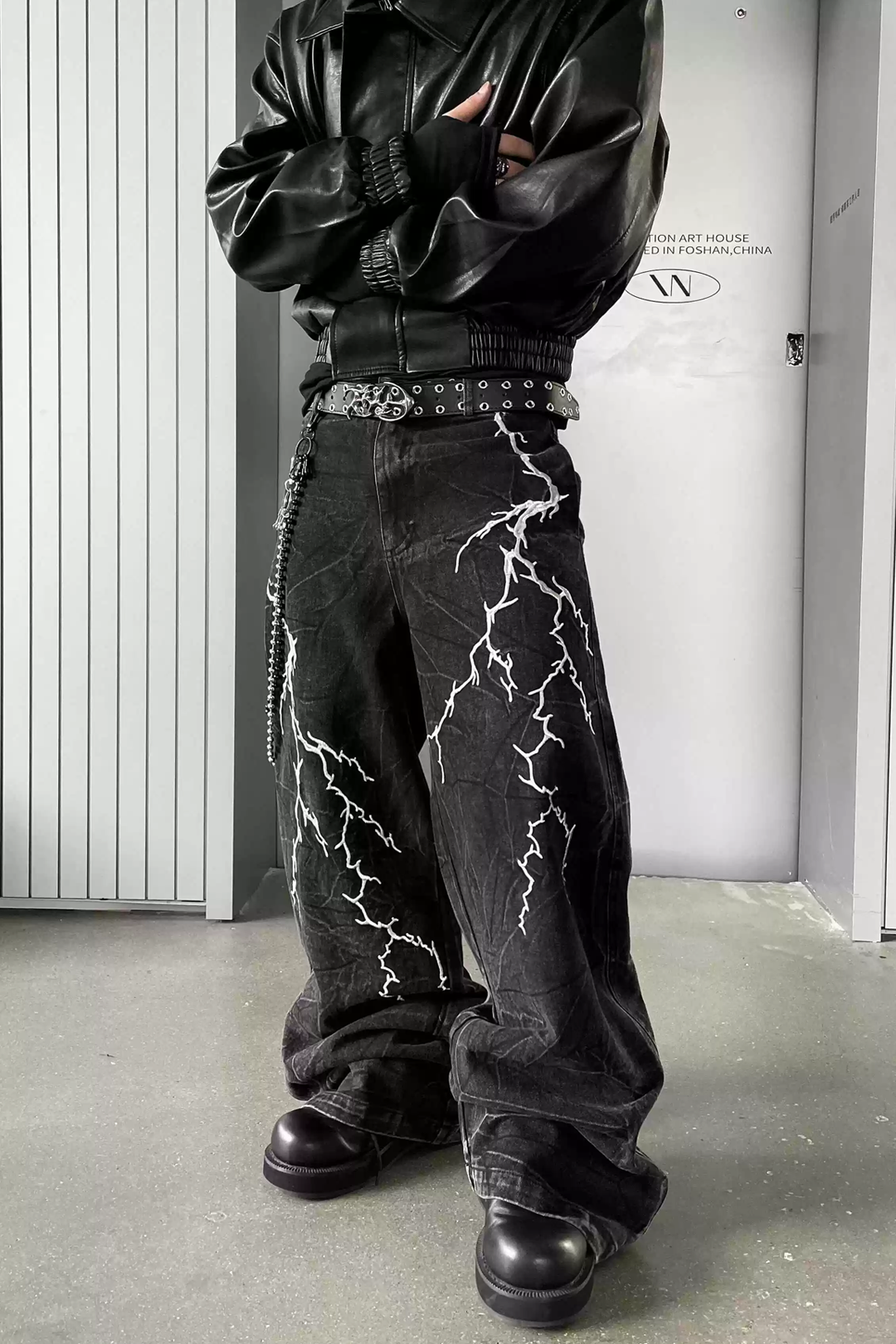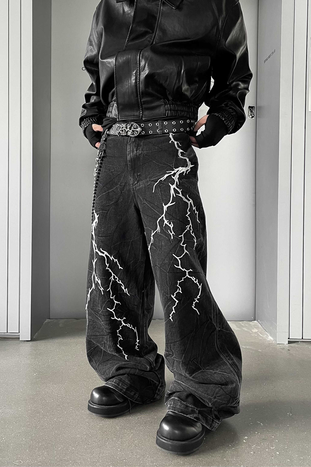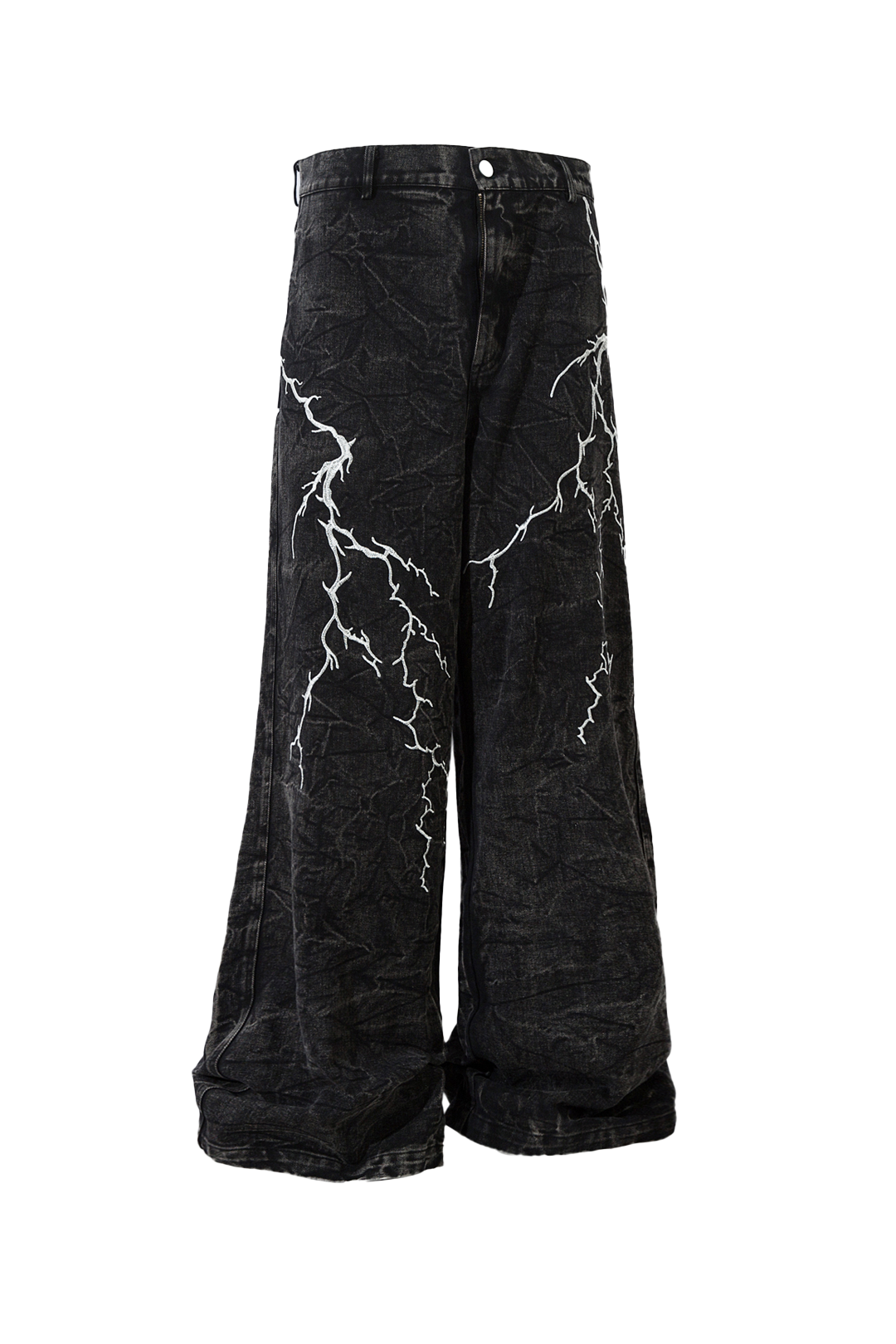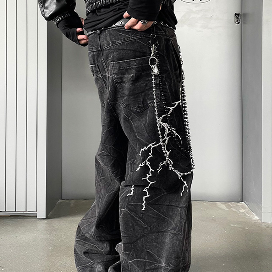 - Design Elements: Lightning embroidery, washed black denim, wide-leg silhouette, stacked hem