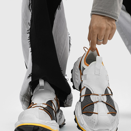 • Detail Features: Low-top chunky profile, multi-panel construction, decorative bungee cords, reinforced toe, ventilated mesh, vintage distressed finish.