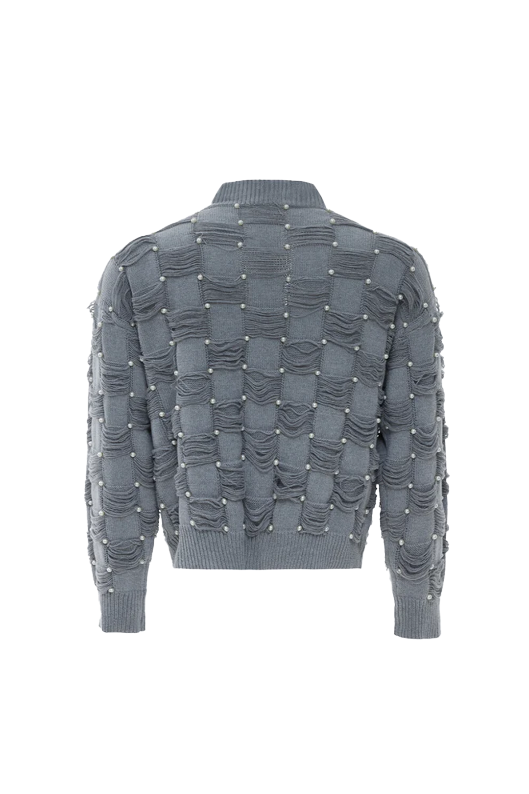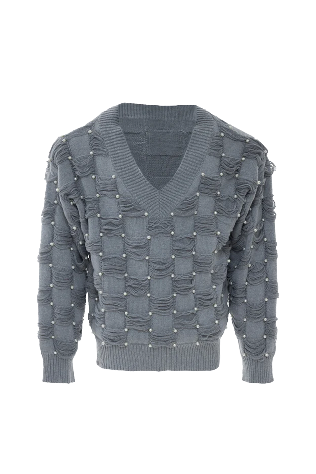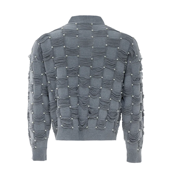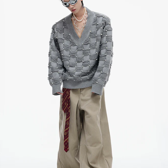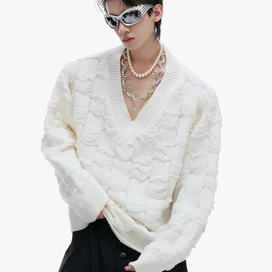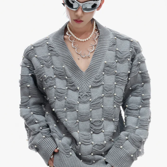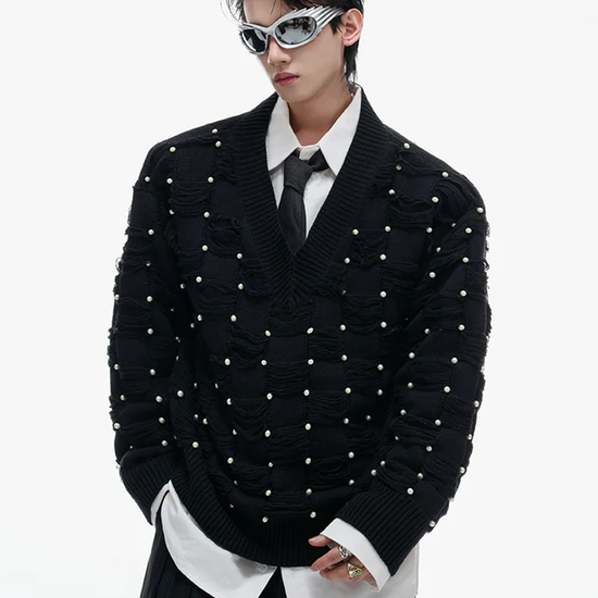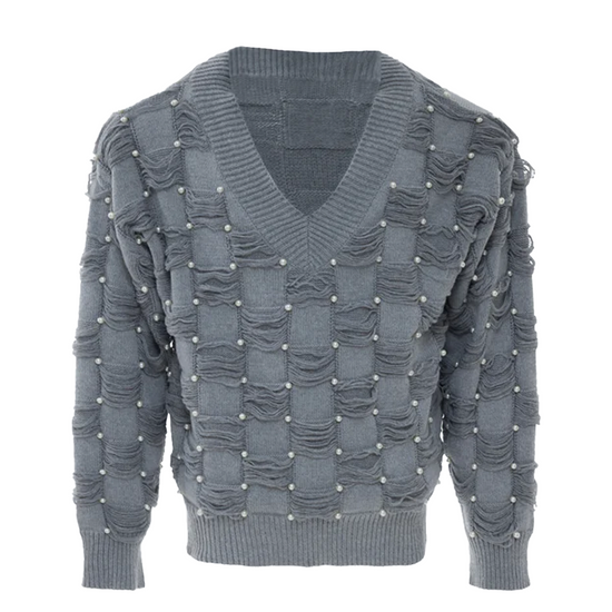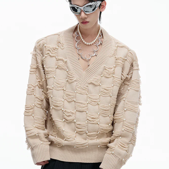 Pearl-Embellished V-Neck Distressed Knit Sweater