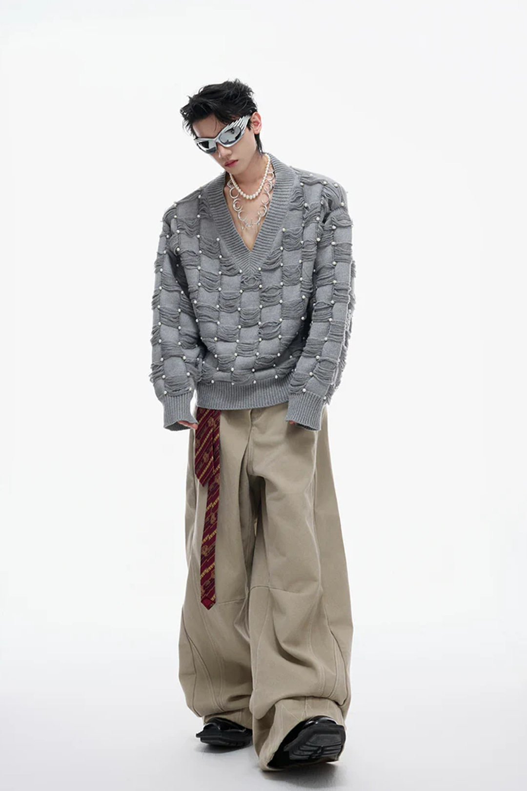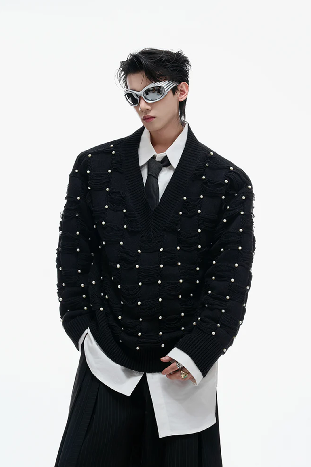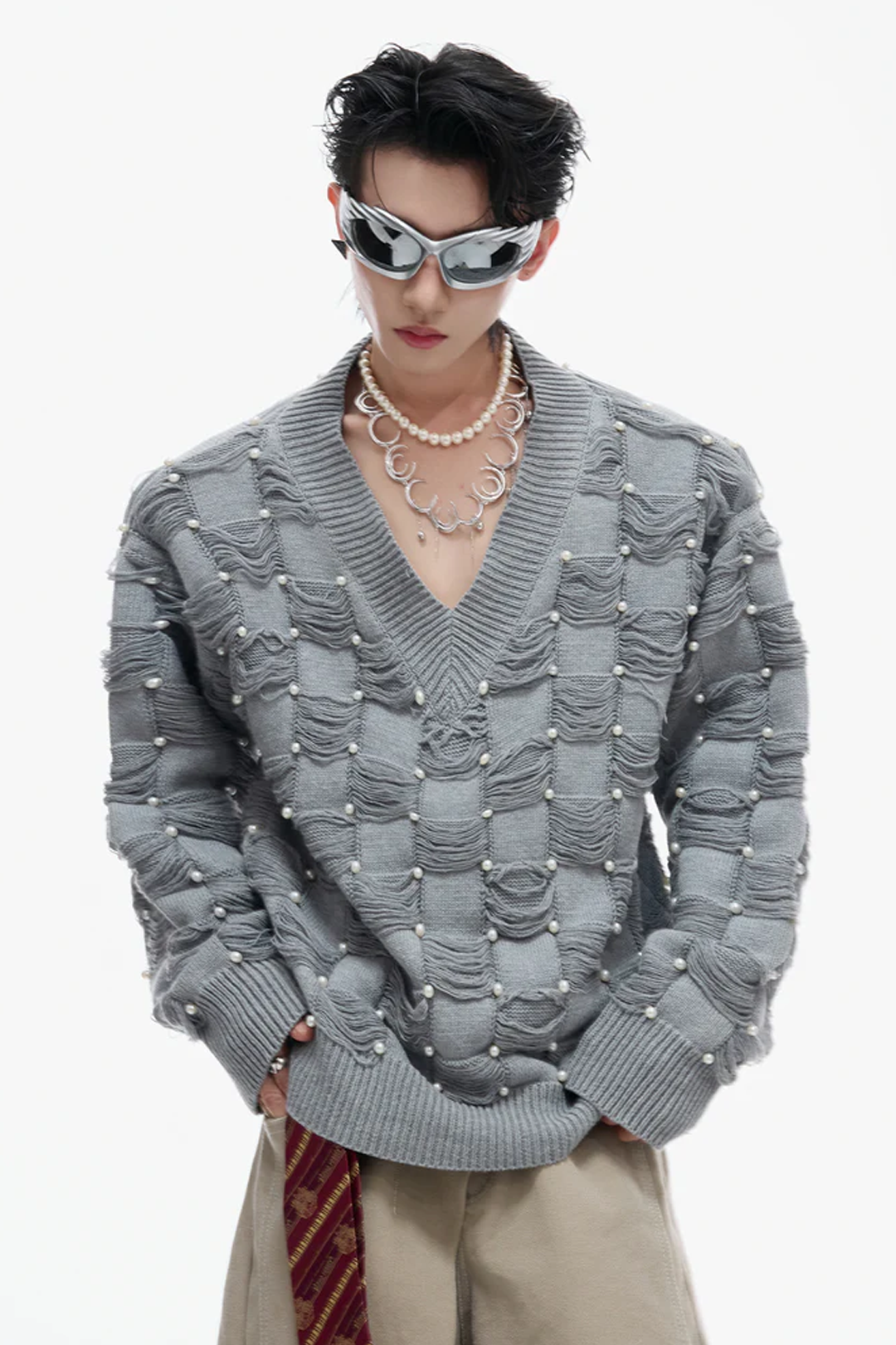 Pearl-Embellished V-Neck Distressed Knit Sweater