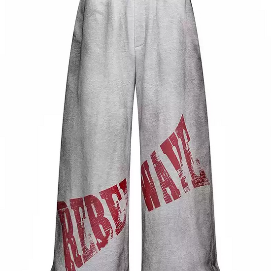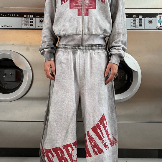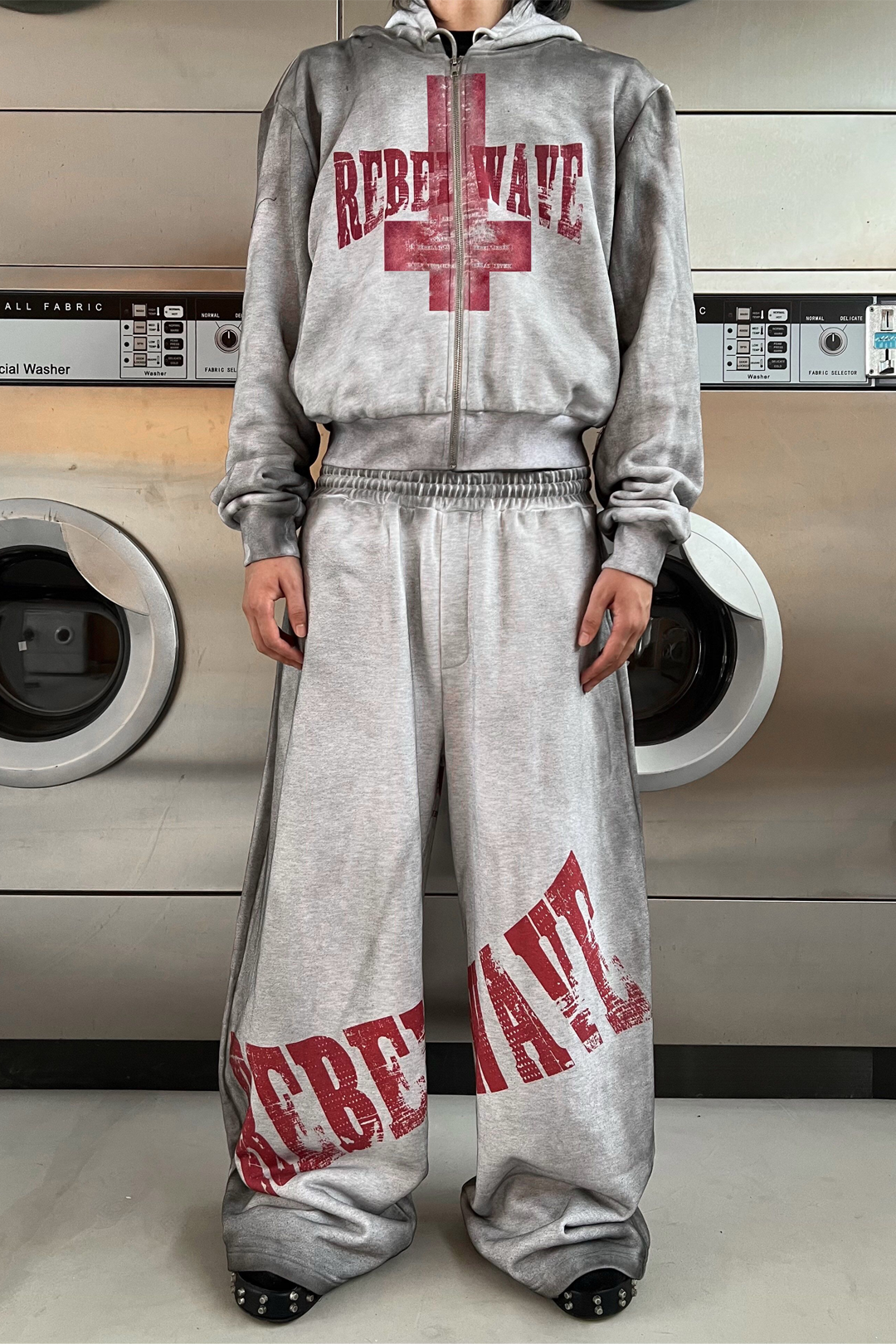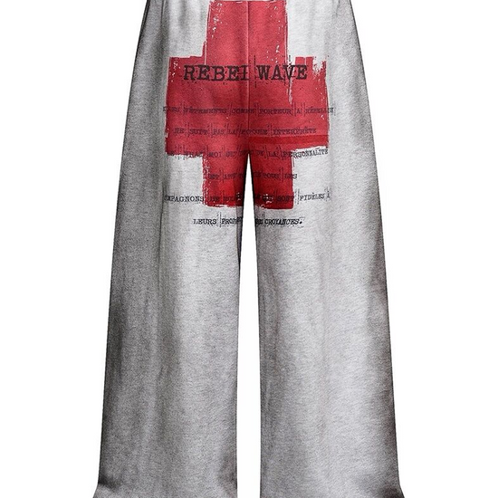 - Design Elements: Reversible wear, distressed cross print, elastic waist, extra-wide leg