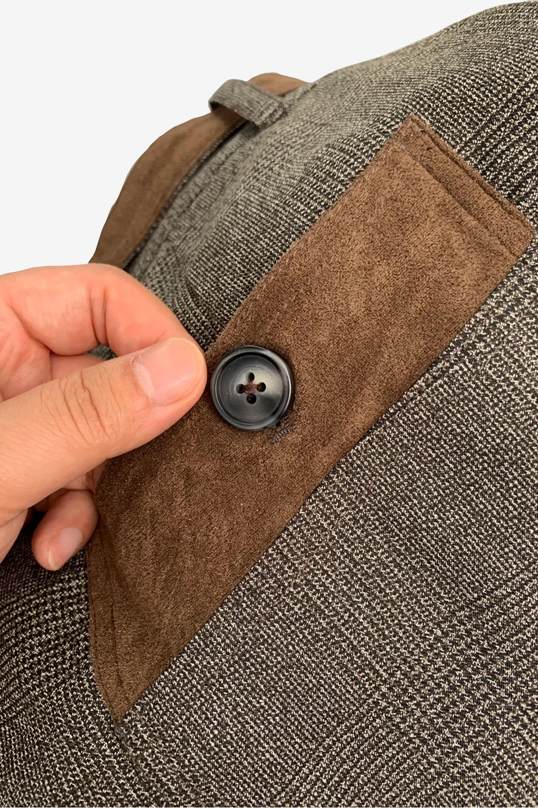 - Classic houndstooth base updated with suede belt accents