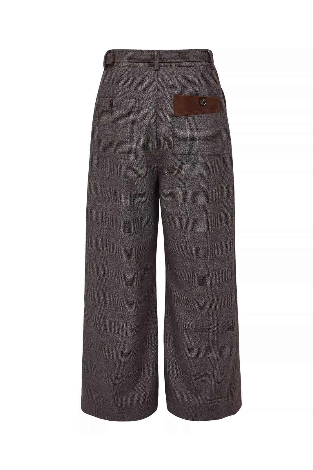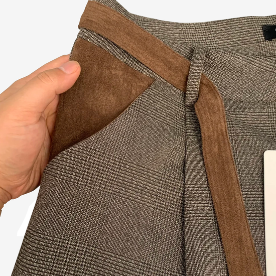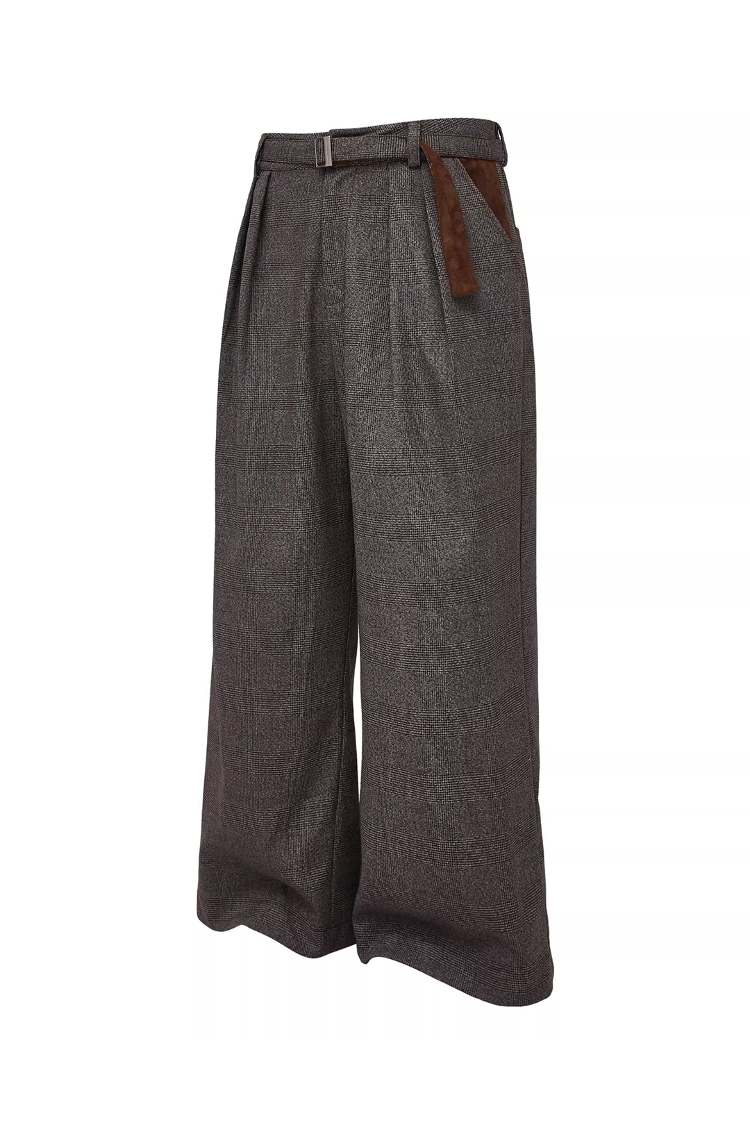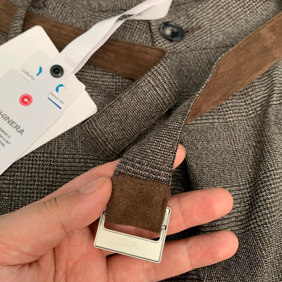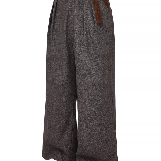 - Design Elements: Houndstooth texture, suede patchwork belt detail, wide-leg cut, old-money aesthetic