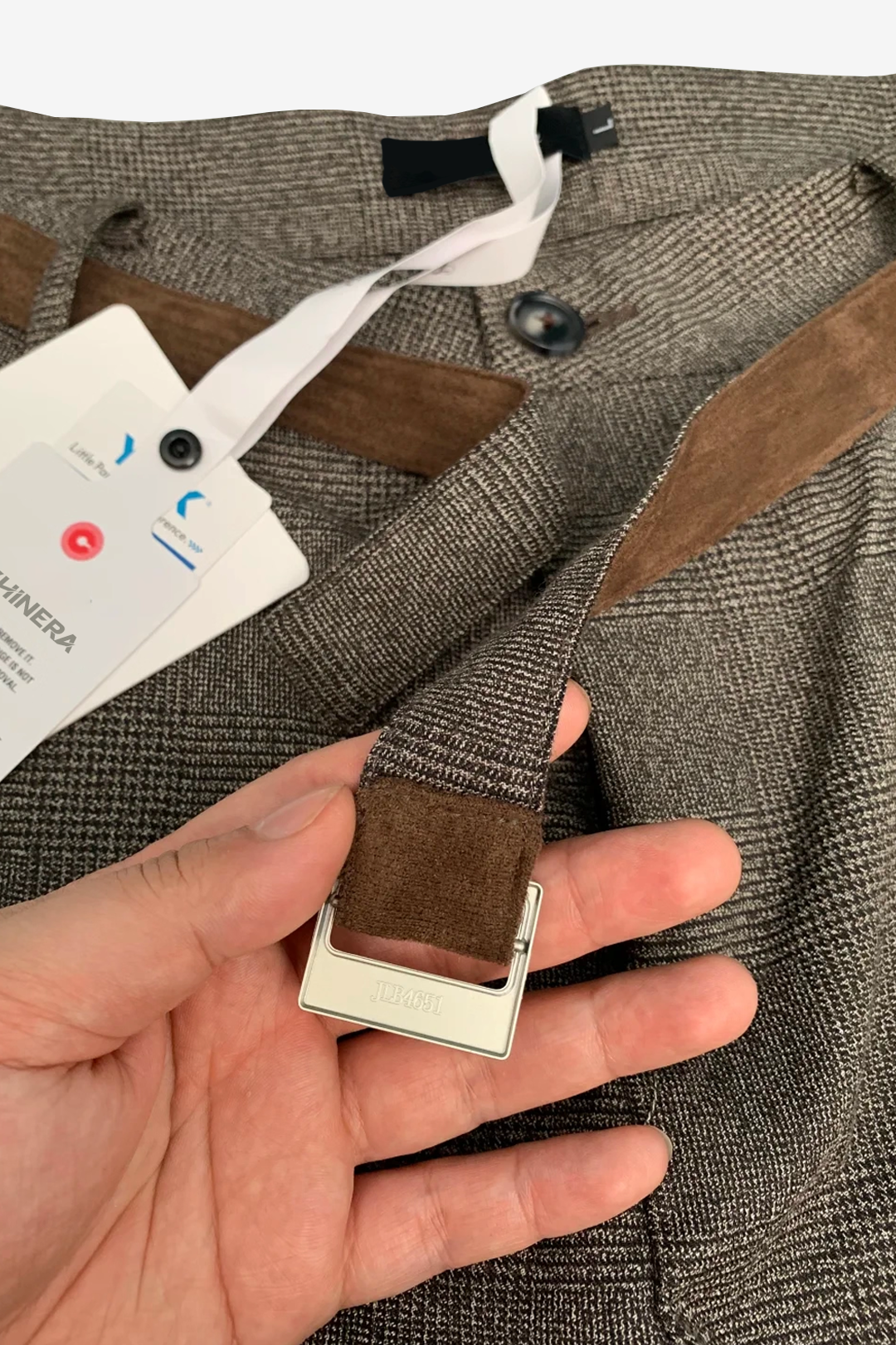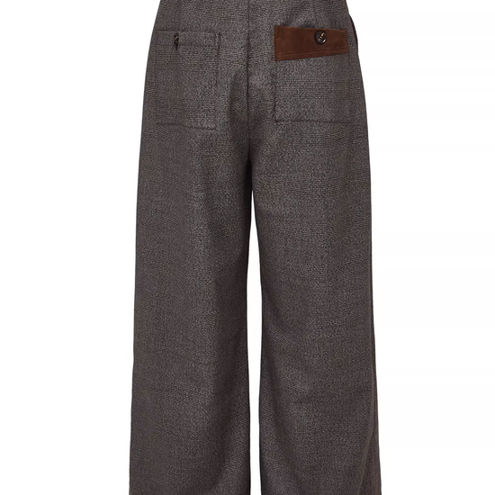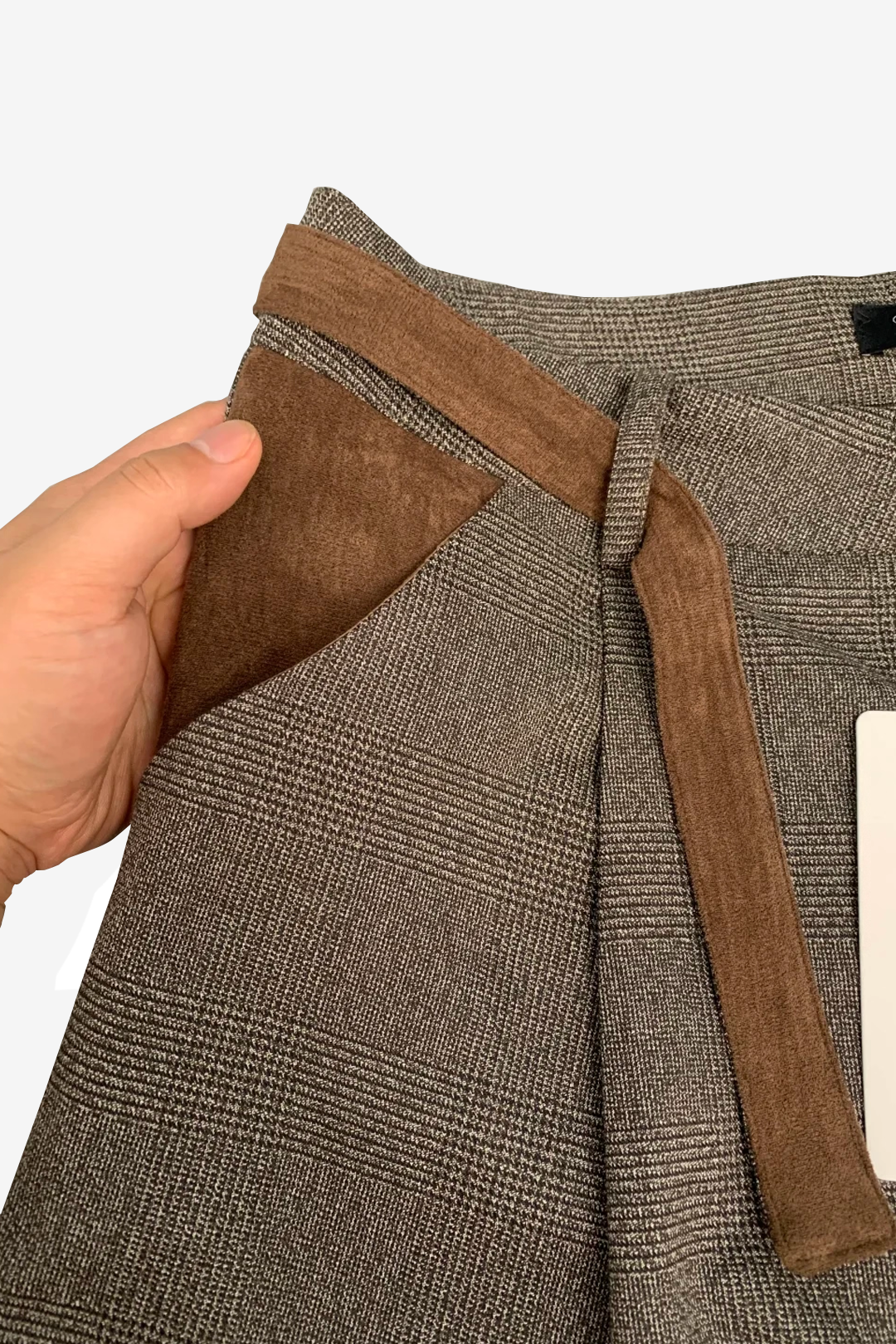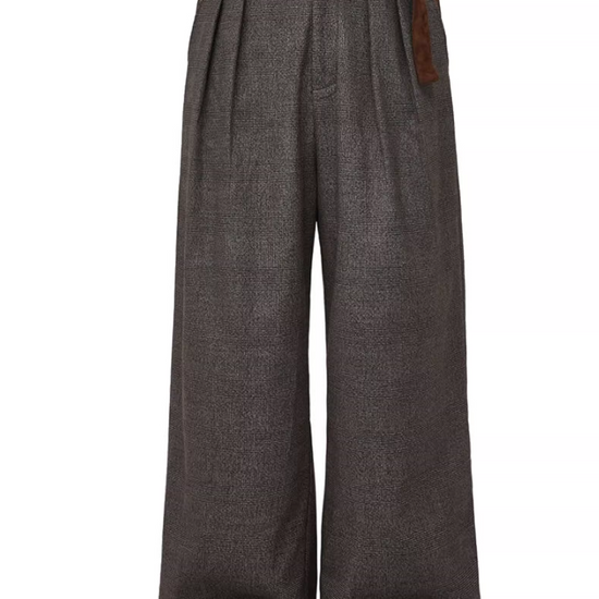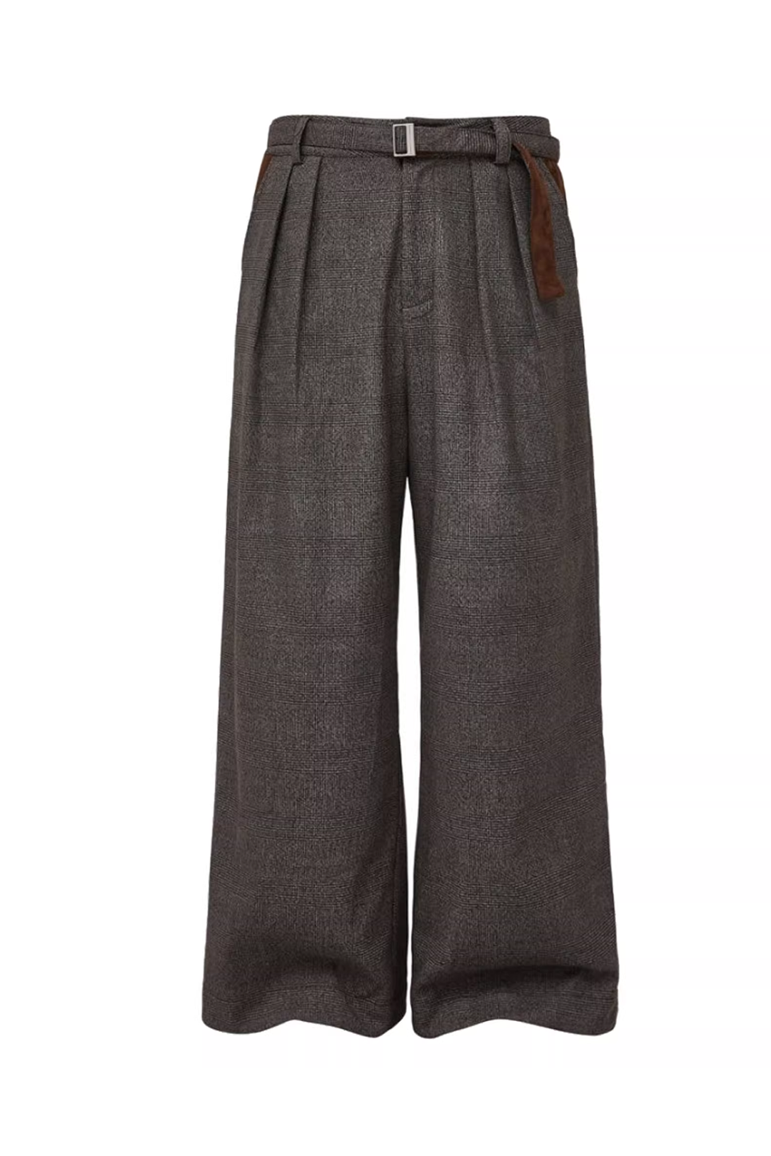 - Design Elements: Houndstooth texture, suede patchwork belt detail, wide-leg cut, old-money aesthetic