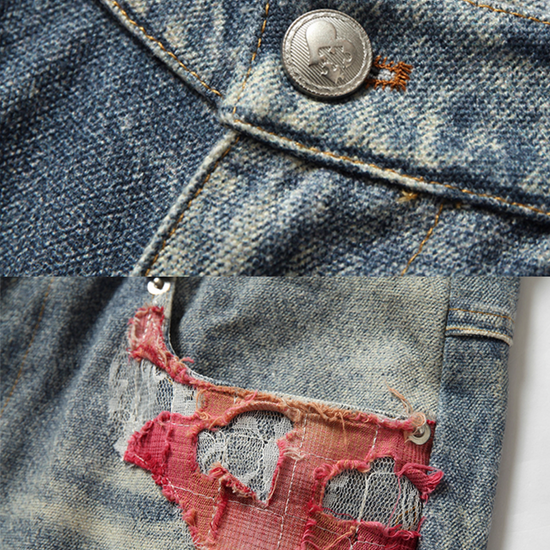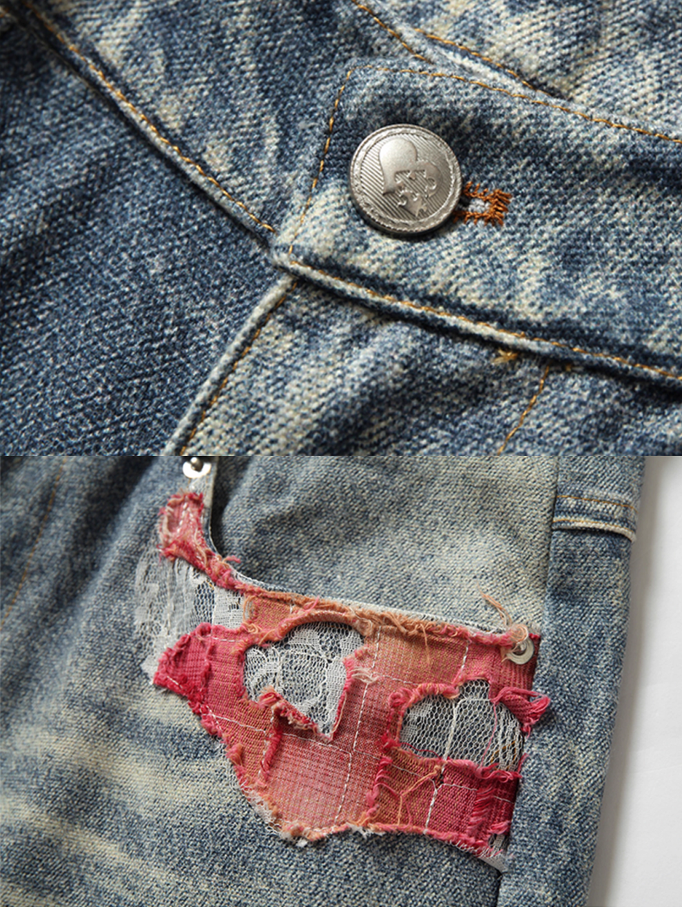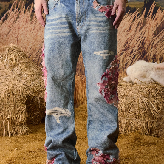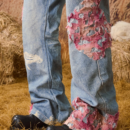 - Design Elements: Sunset-tone lace patchwork, destroyed panels, heavy wash, wide-leg baggy silhouette