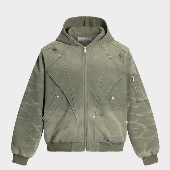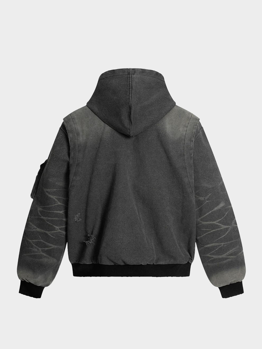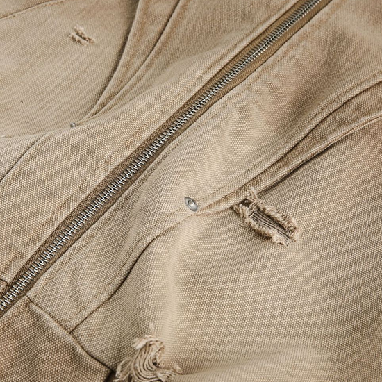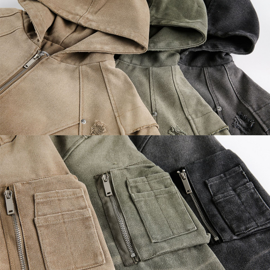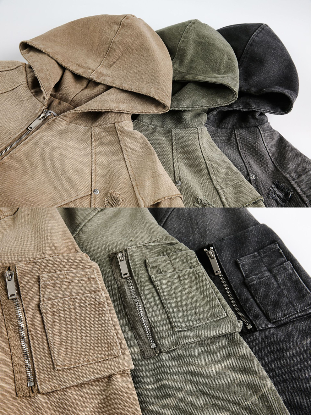 - Design Elements: Heavy washed canvas, distressed detailing, structured paneling, full zip hoodie