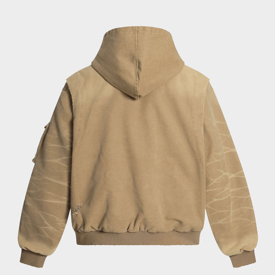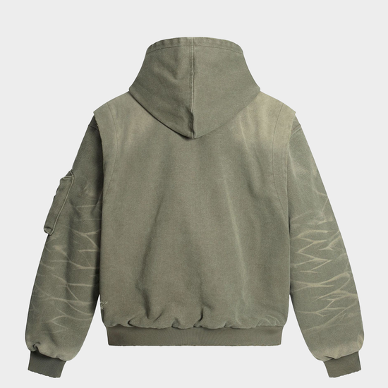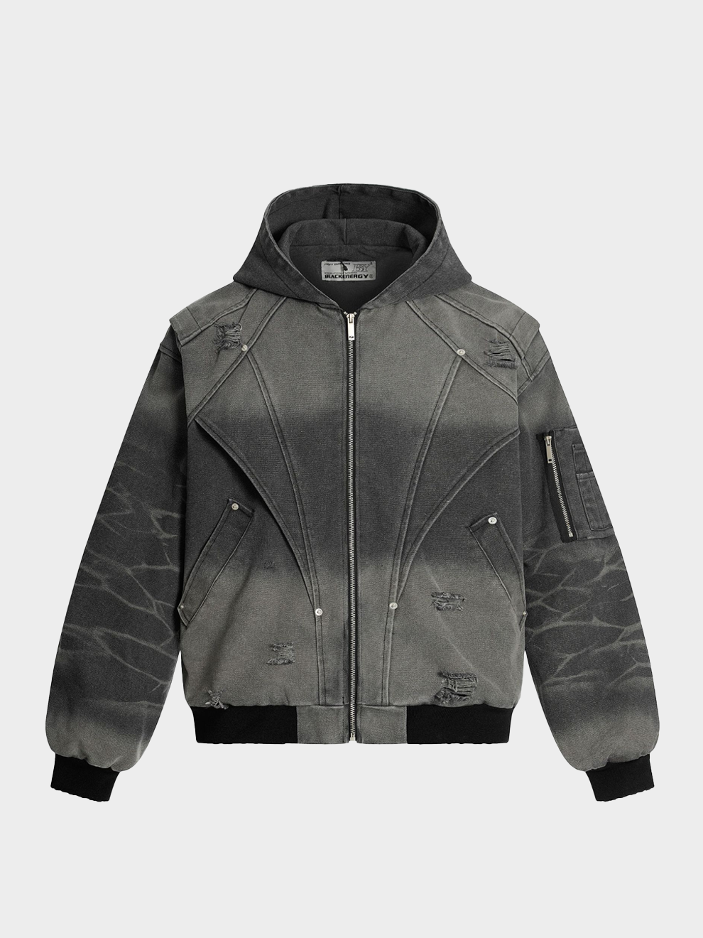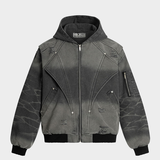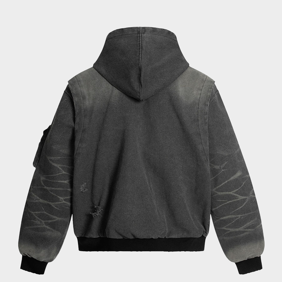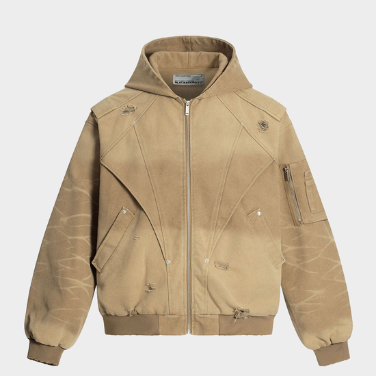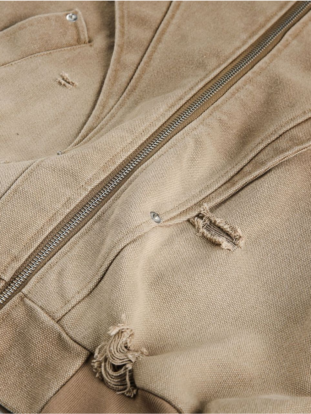 - Design Elements: Heavy washed canvas, distressed detailing, structured paneling, full zip hoodie