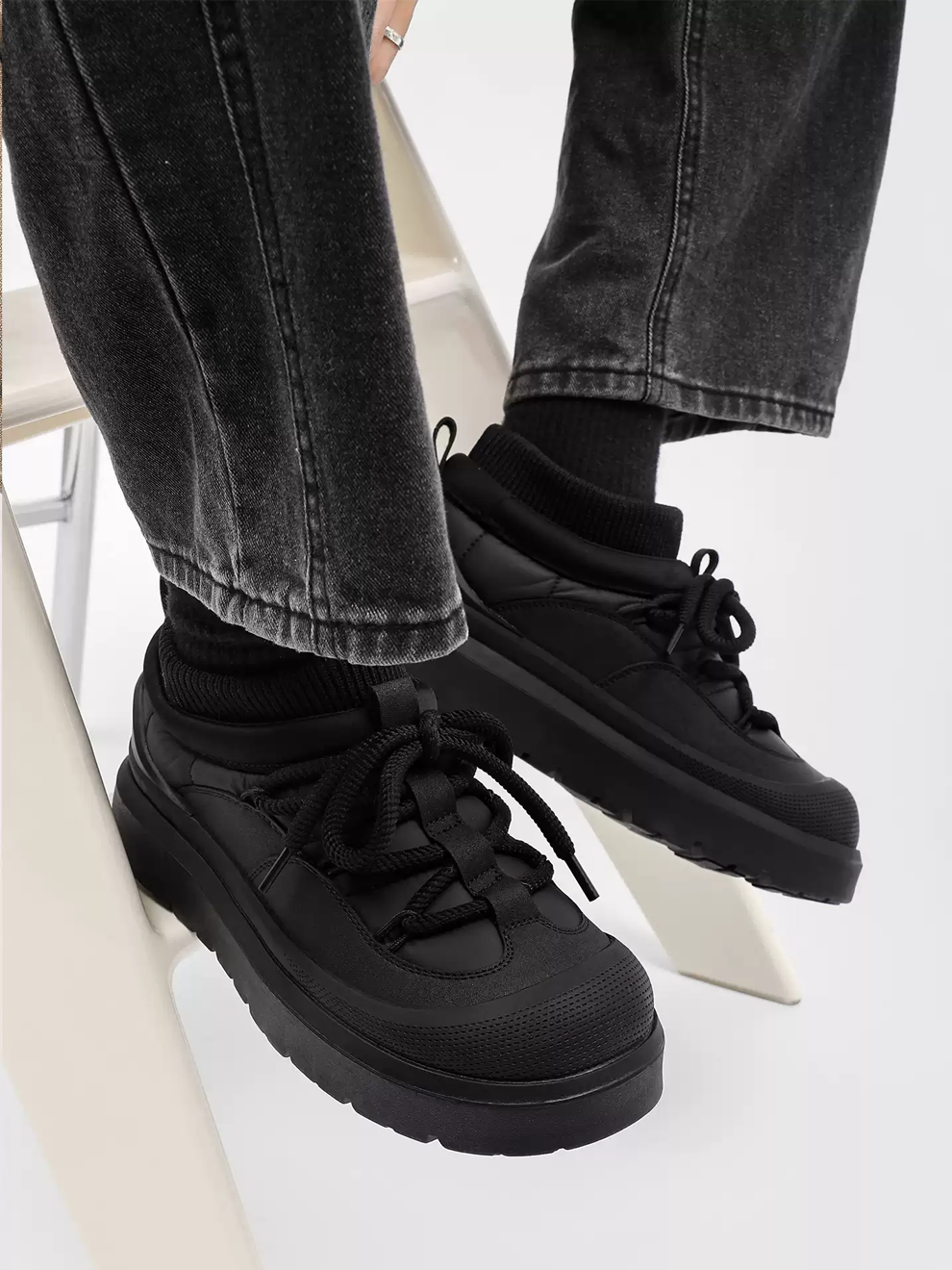 - Thick midsole + lug outsole for shock absorption and traction.