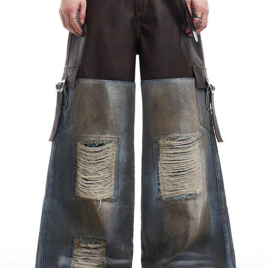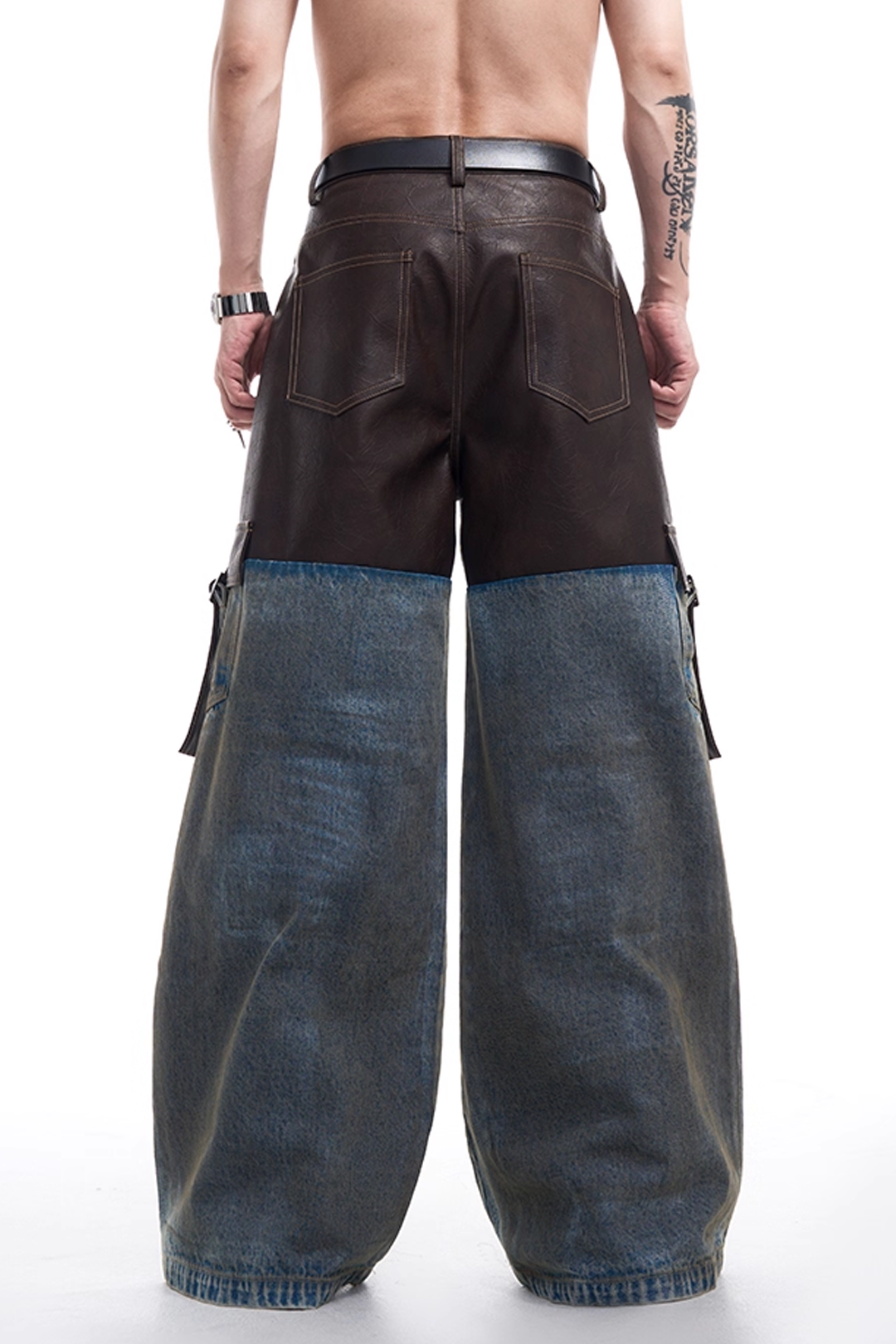 - Design Elements: Faux-leather upper panel, distressed denim knees, cargo side straps, wide-leg silhouette
