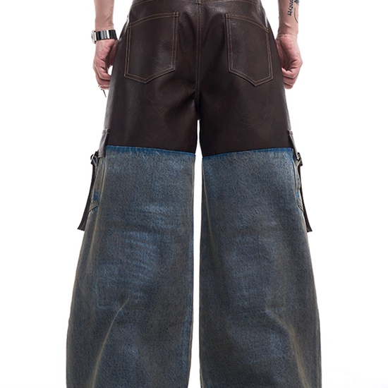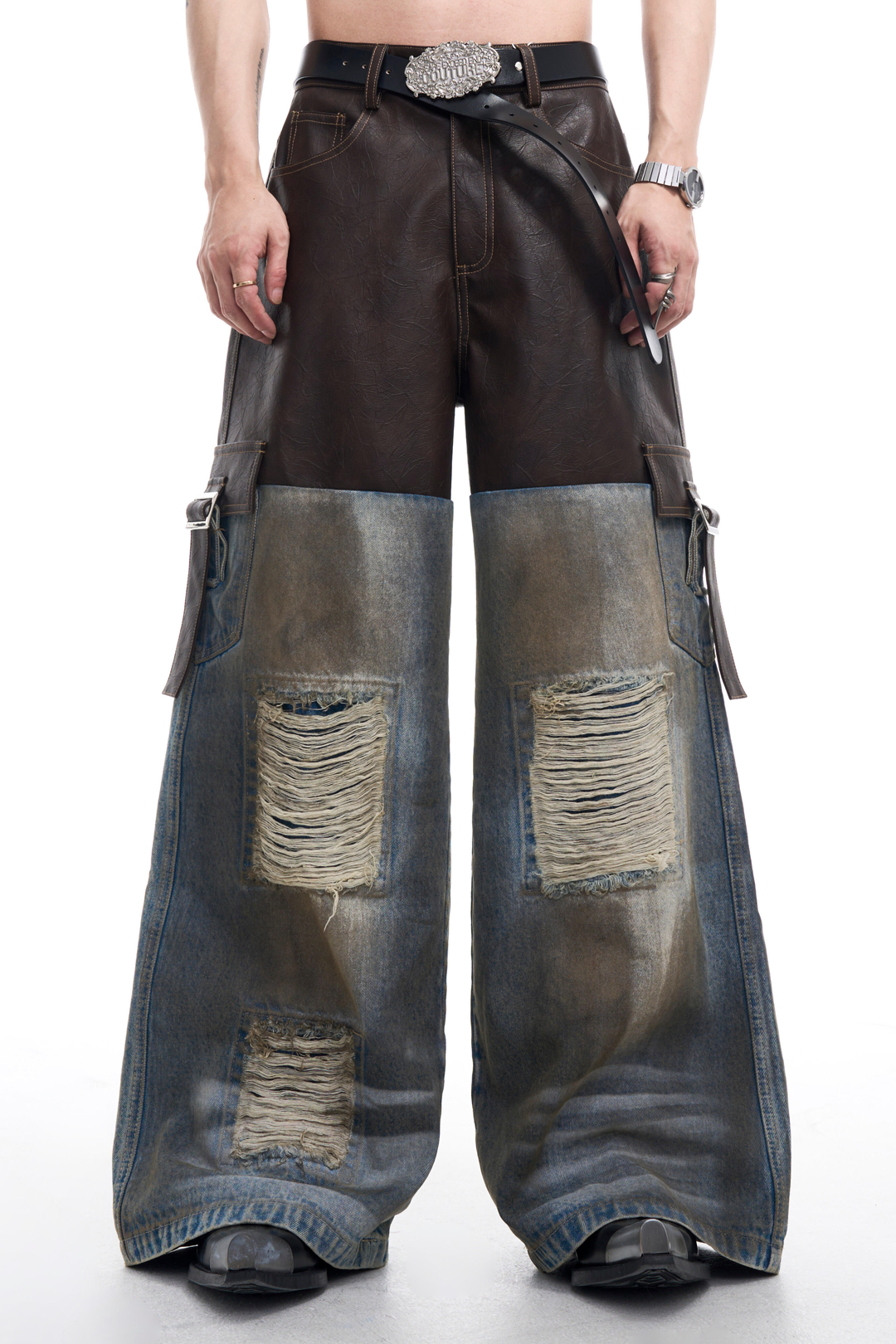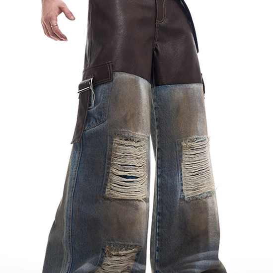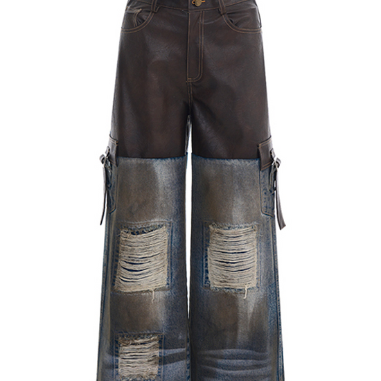 Vintage Patch Leather × Distressed Denim Wide-Leg Pants