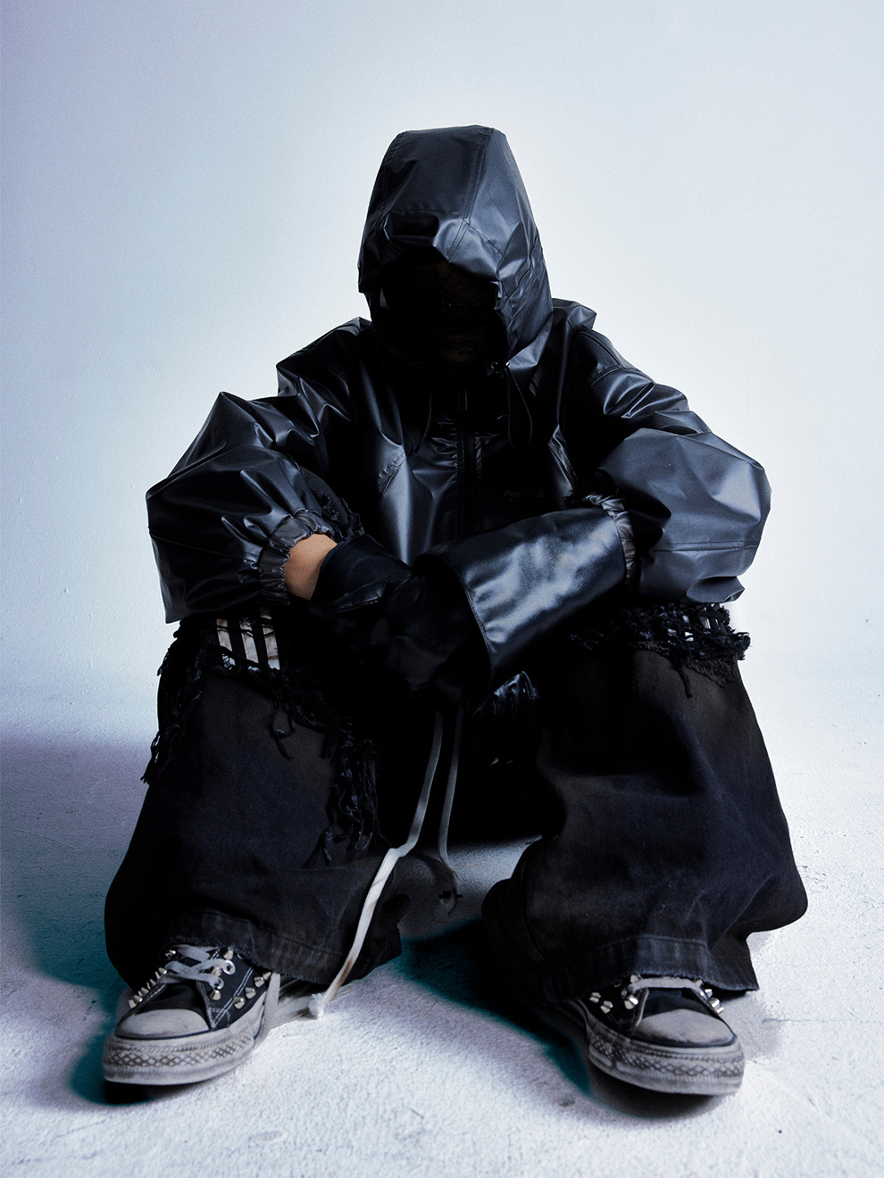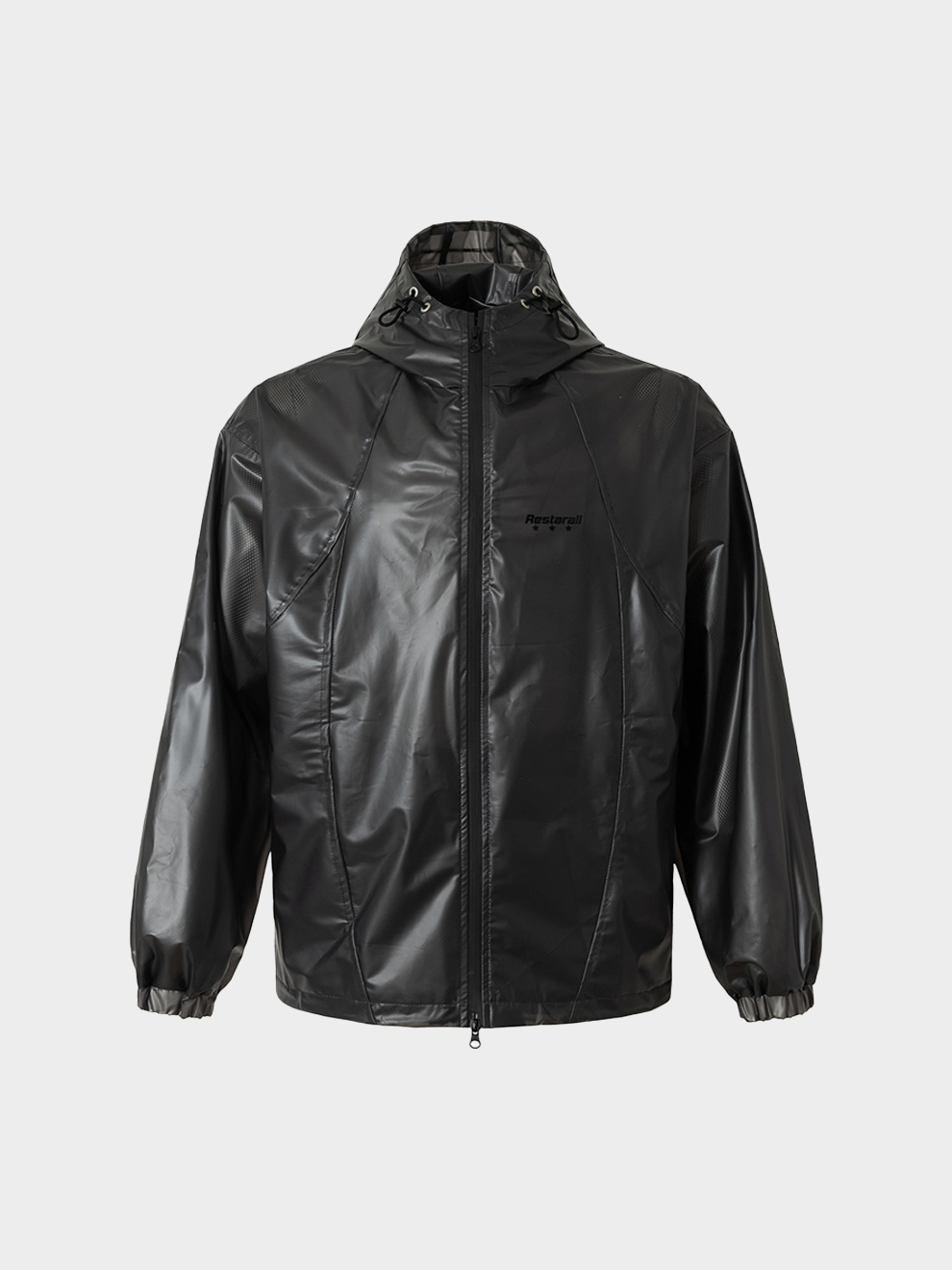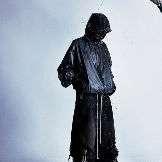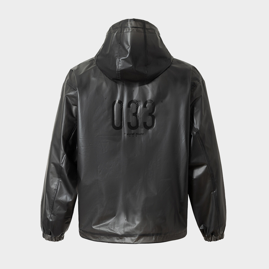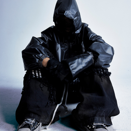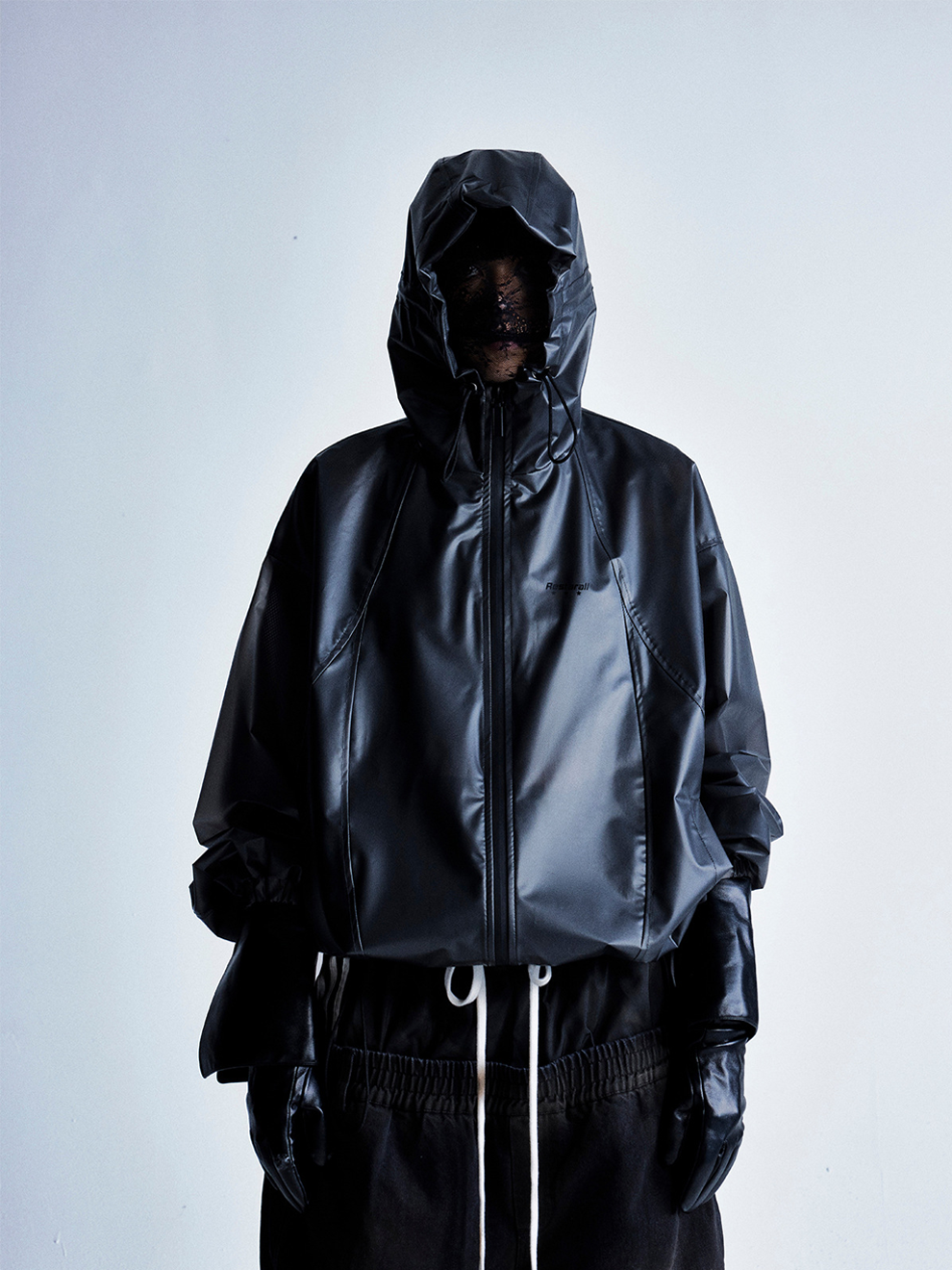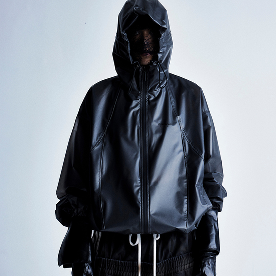 - Design Elements: Matte black PU leather, adjustable hood, front zipper, relaxed drop-shoulder cut