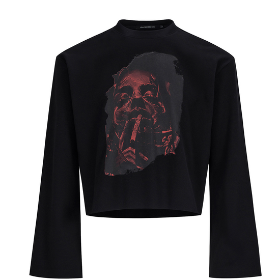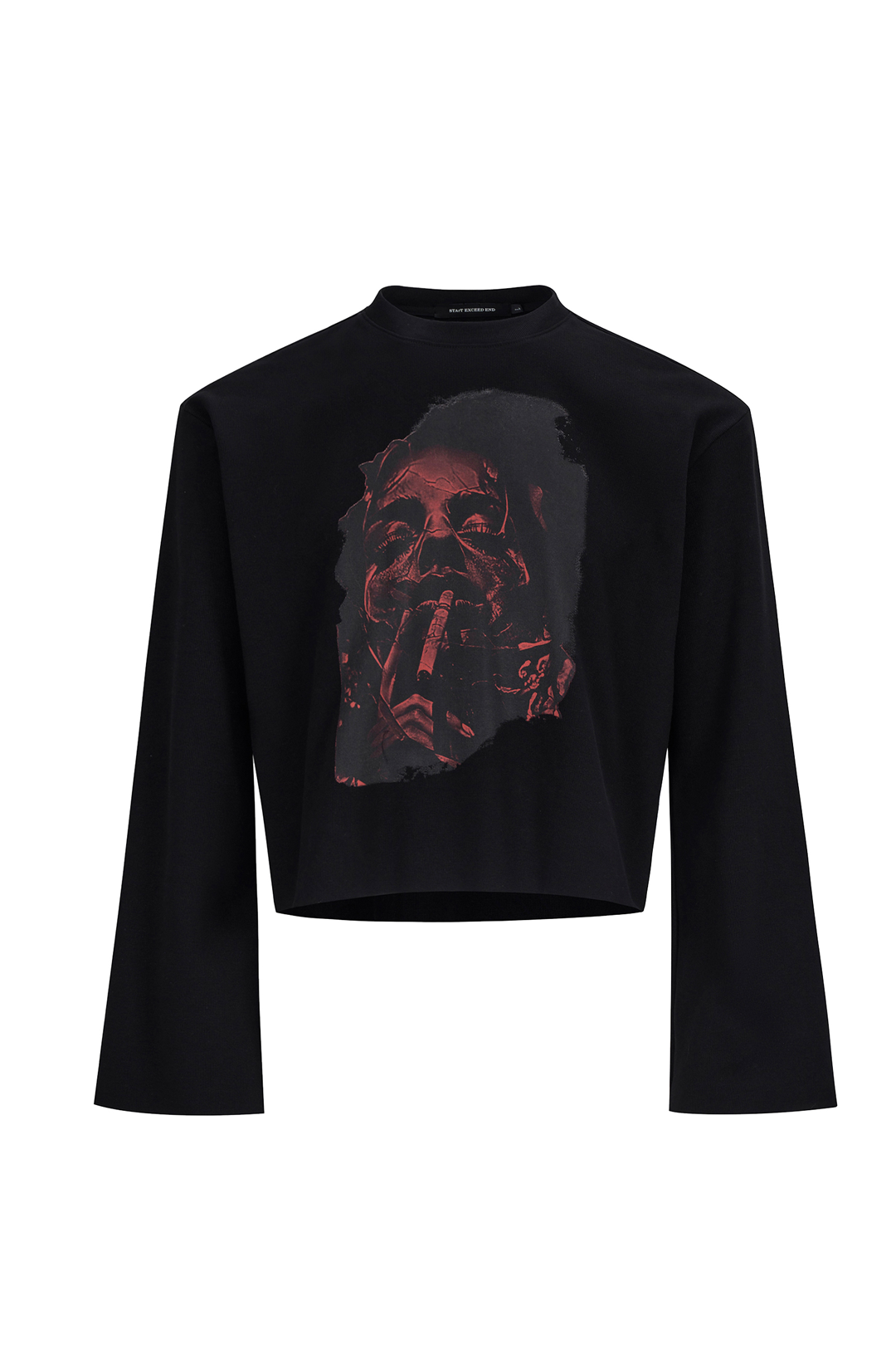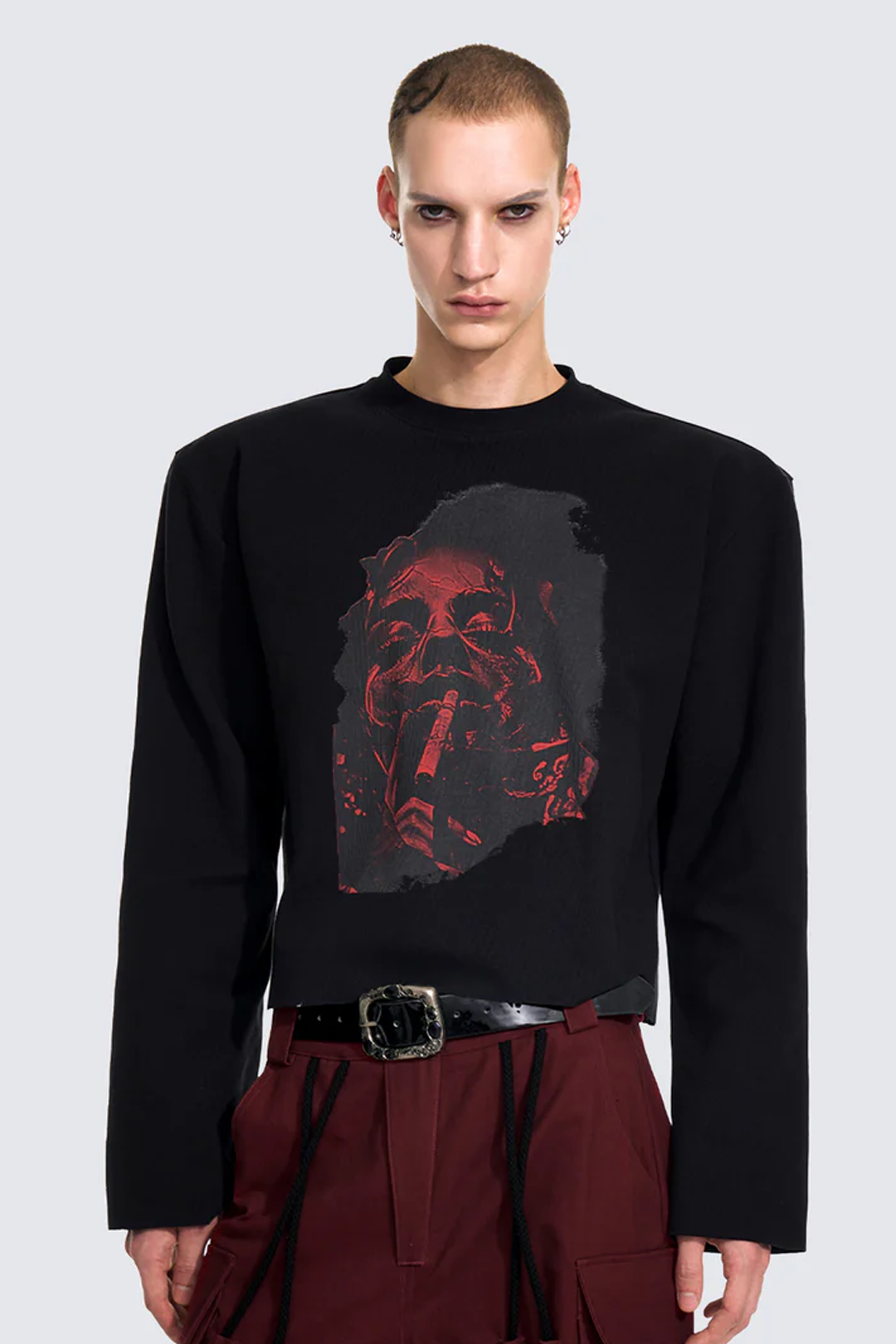 - Design Elements: Cropped length, bold vintage print, wide sleeves, edgy cut