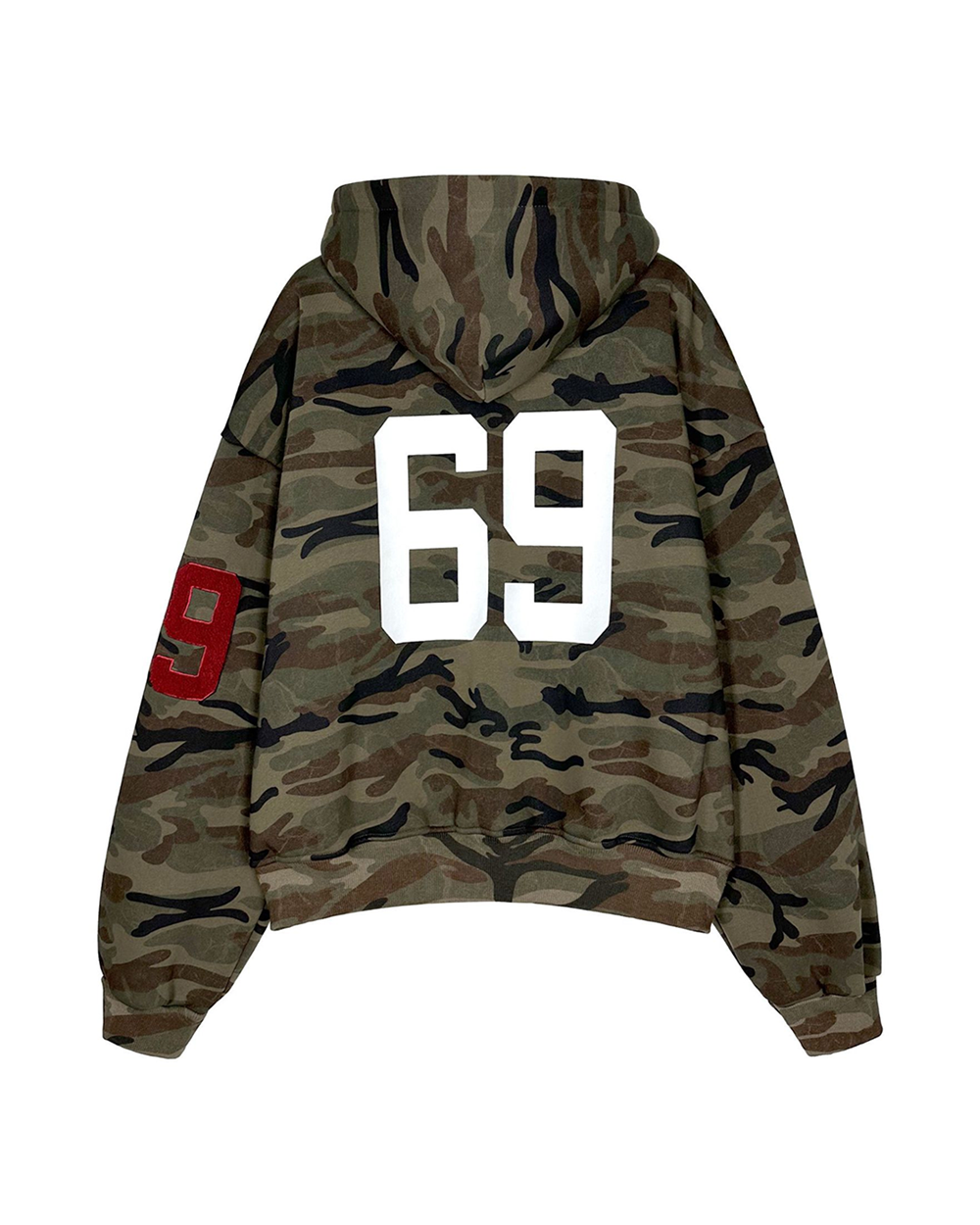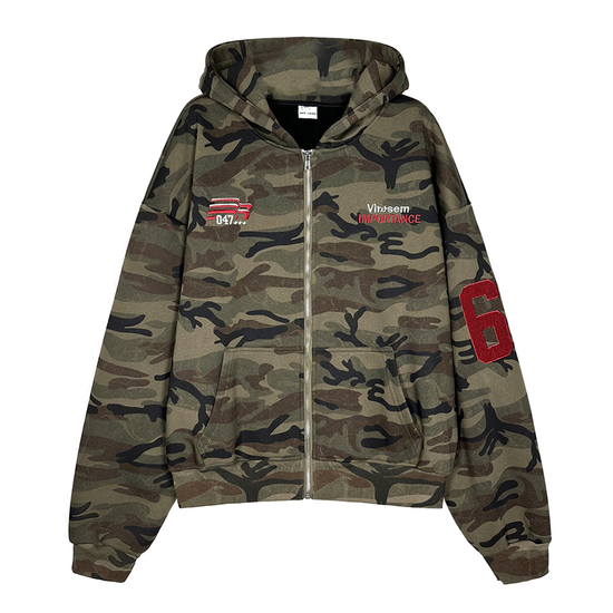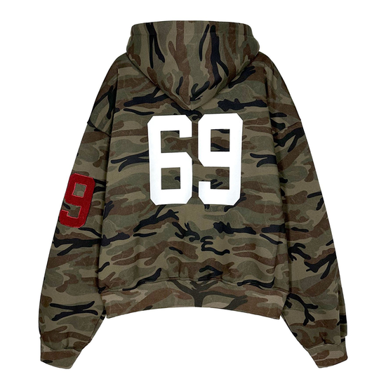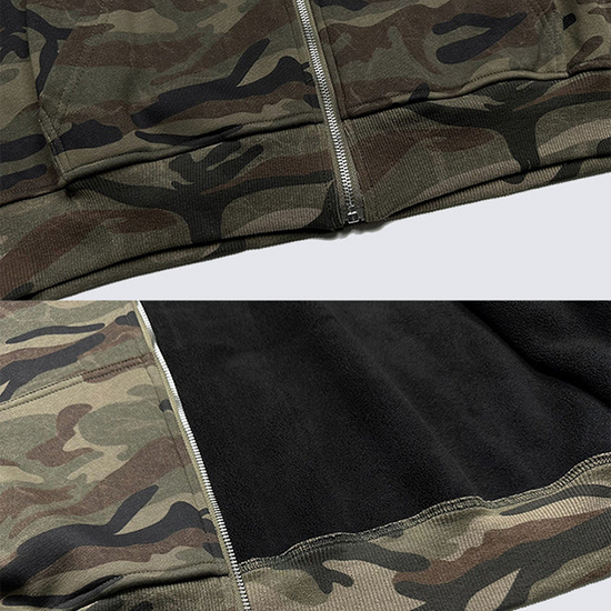 - Design Elements: Heavy camo print, fleece-lined interior, embroidered sleeve patch, oversized hood
