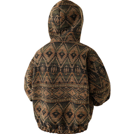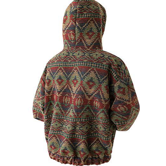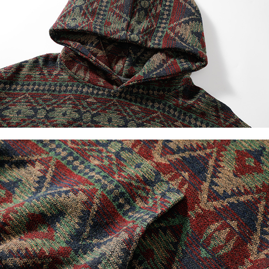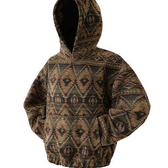 - Design Elements: Oversized hood, ethnic-inspired pattern, kangaroo pocket, wool blend fabric