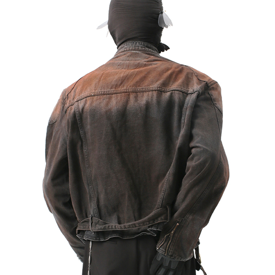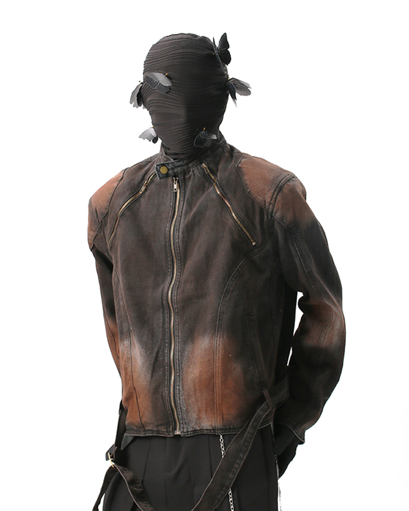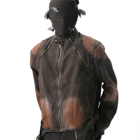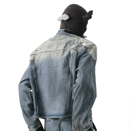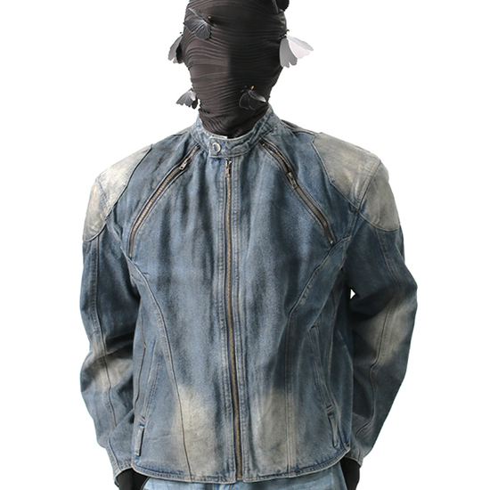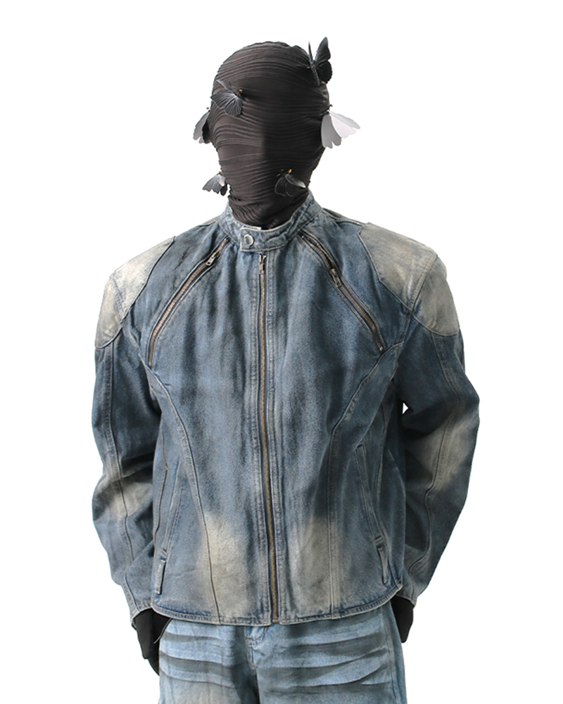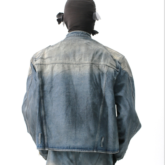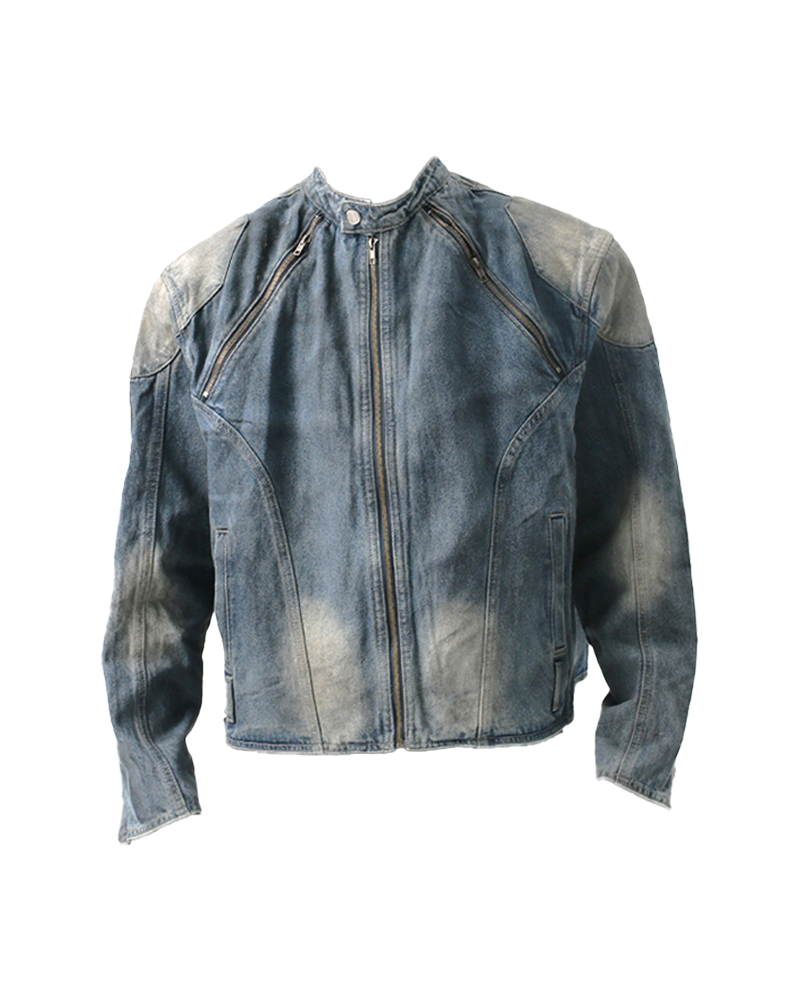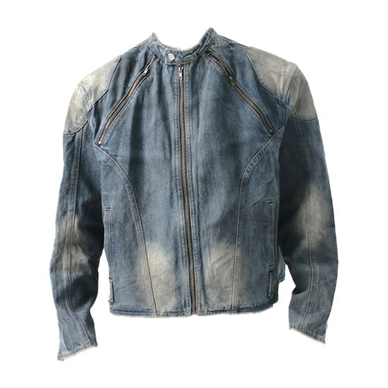 A vintage-inspired denim jacket featuring washed texture, bold zipper detailing, and structured padded shoulders. The oversized silhouette adds a strong, worn-in aesthetic perfect for modern streetwear looks.