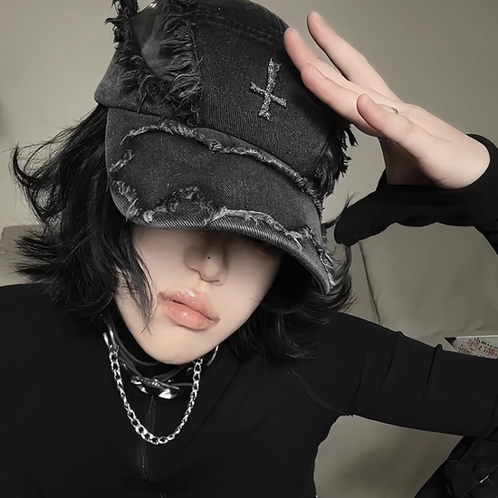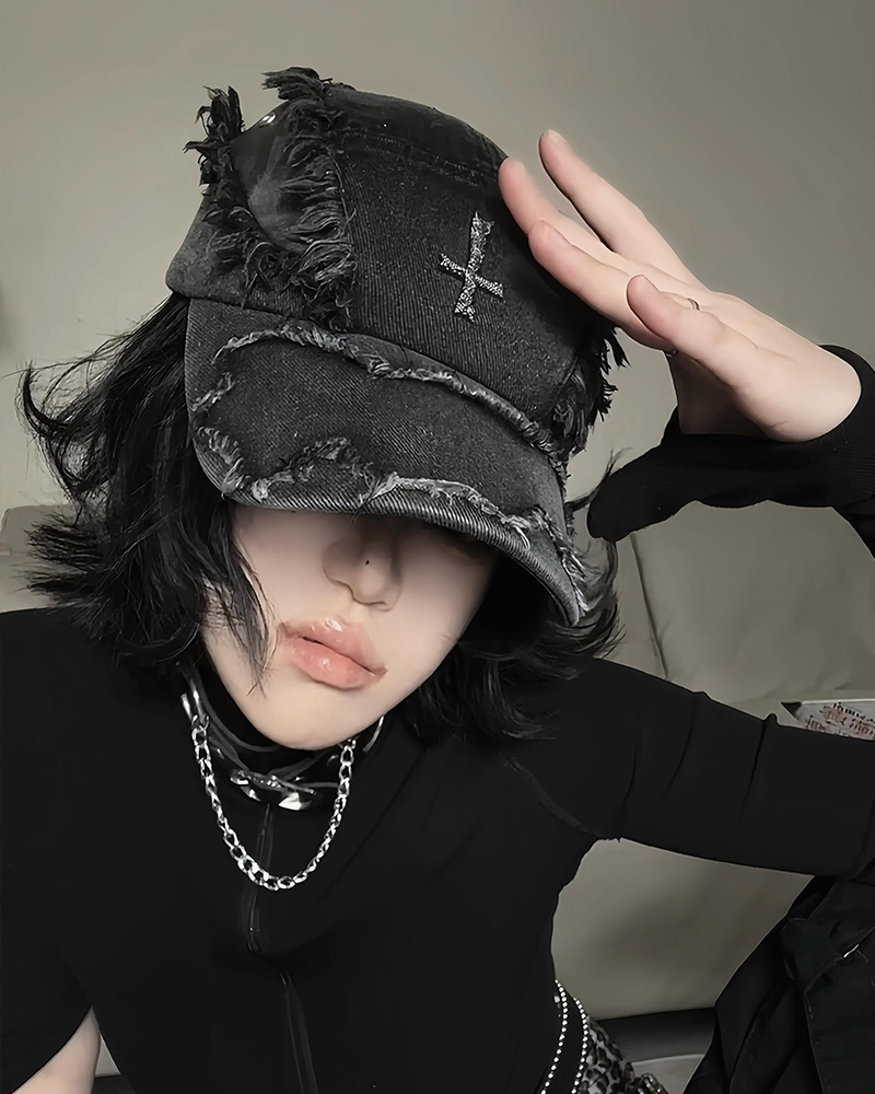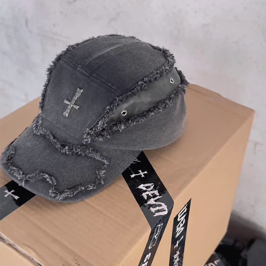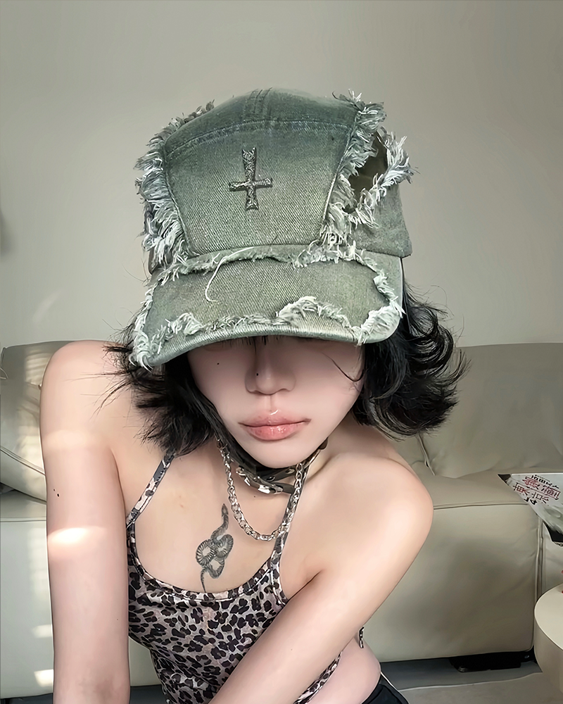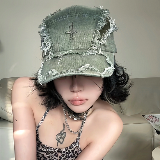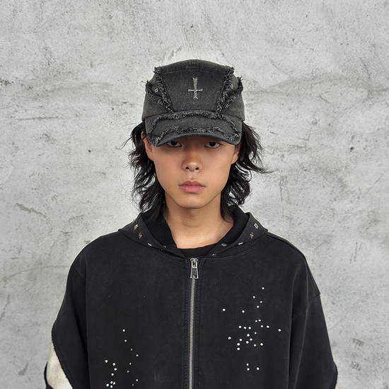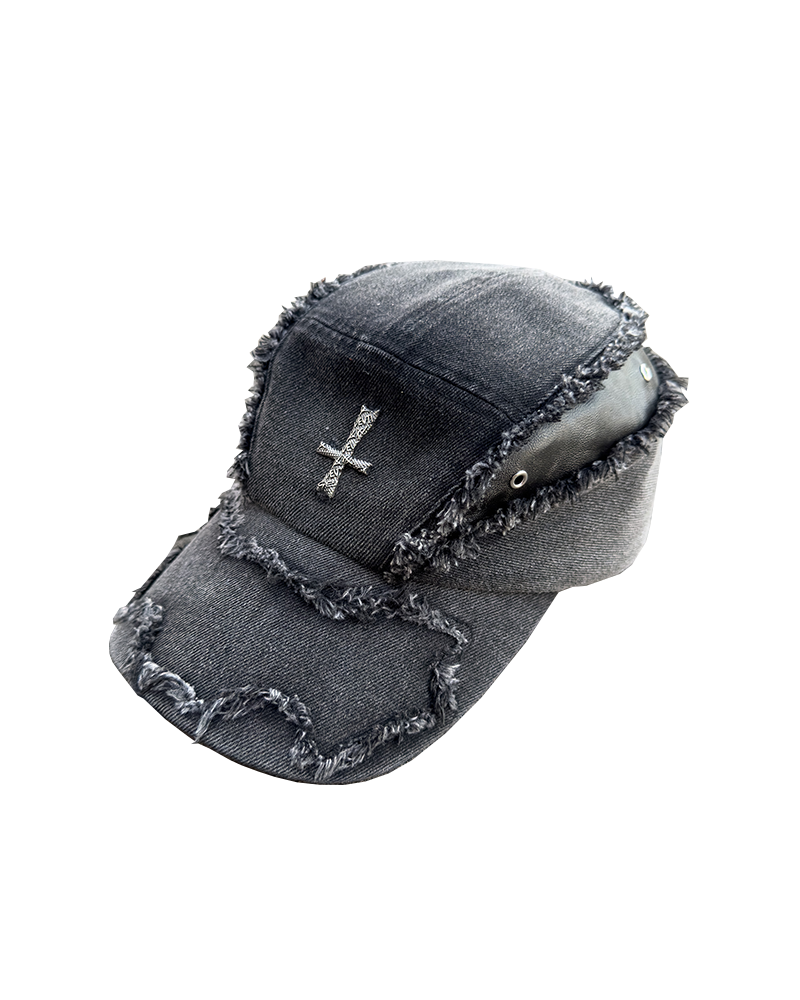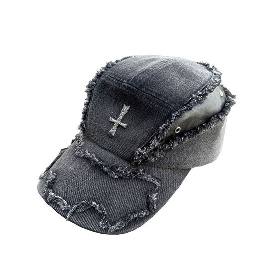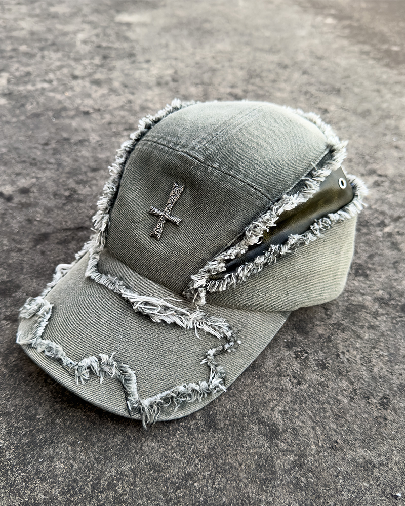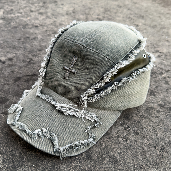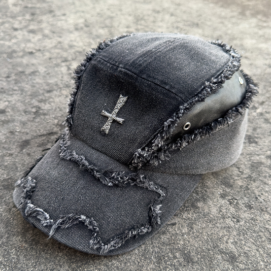This standout cap combines washed denim, distressed details, and a bold cross leather patch. A perfect blend of vintage grit and streetwear edge—adjustable and unisex.