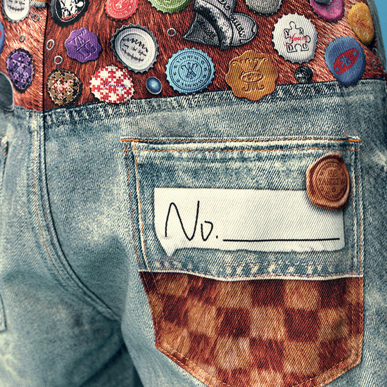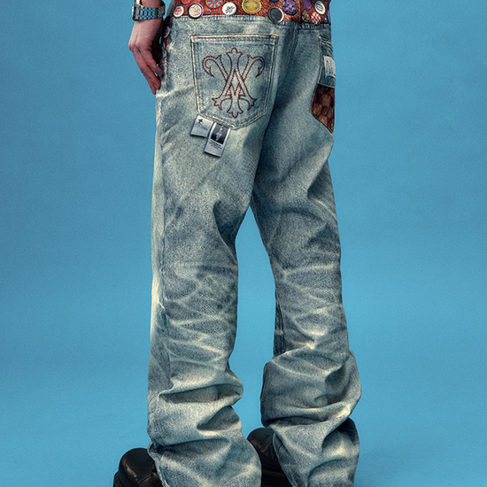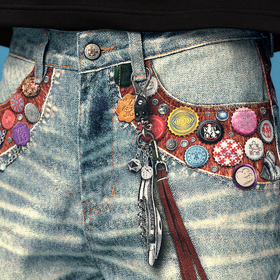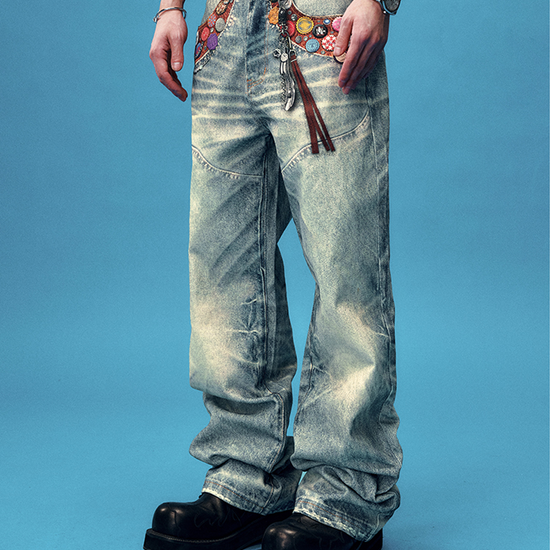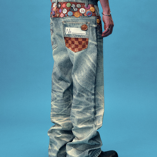 - Design Elements: Distressed wash finish, colorful bottle-cap badges, multi-patch prints, button fly