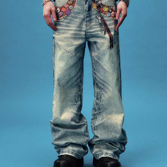 Yadrew Bottle Cap Patchwork Vintage Printed Jeans